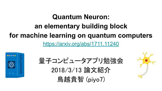量子コンピュータアプリ勉強会の発表資料です。 元論文『Quantum Neuron: an elementary building block for machine learning on quantum computers』は下記リンクから。 https://arxiv.org/abs/1711.11240