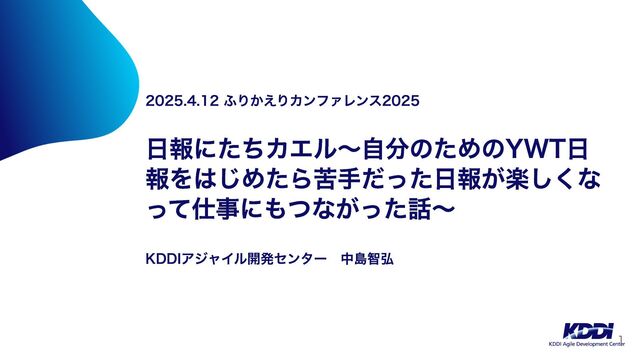 2025.4.12 ふりかえりカンファレンス2025 日報にたちカエル〜自分のためのYWT日 報をはじめたら苦手だった日報が楽しくな って仕事にもつながった話〜 KDDIアジャイル開発センター 中島智弘 1