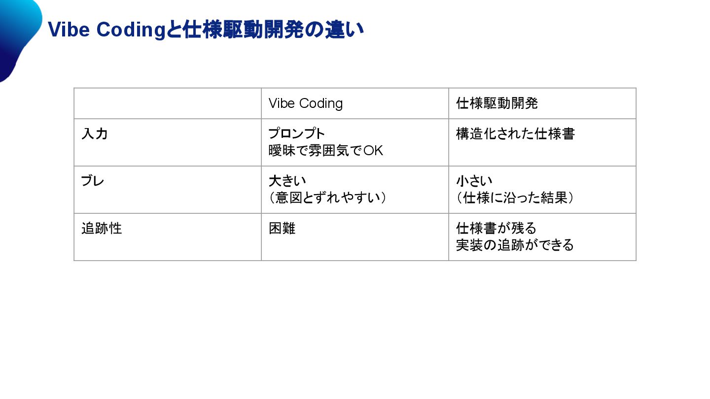 1. Vibe Codingと仕様駆動開発の違い Vibe Coding 仕様駆動開発 入力 プロンプト 曖昧で雰囲気でOK 構造化された仕様書 ブレ