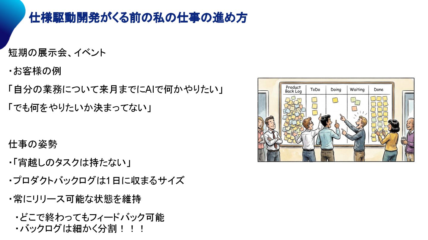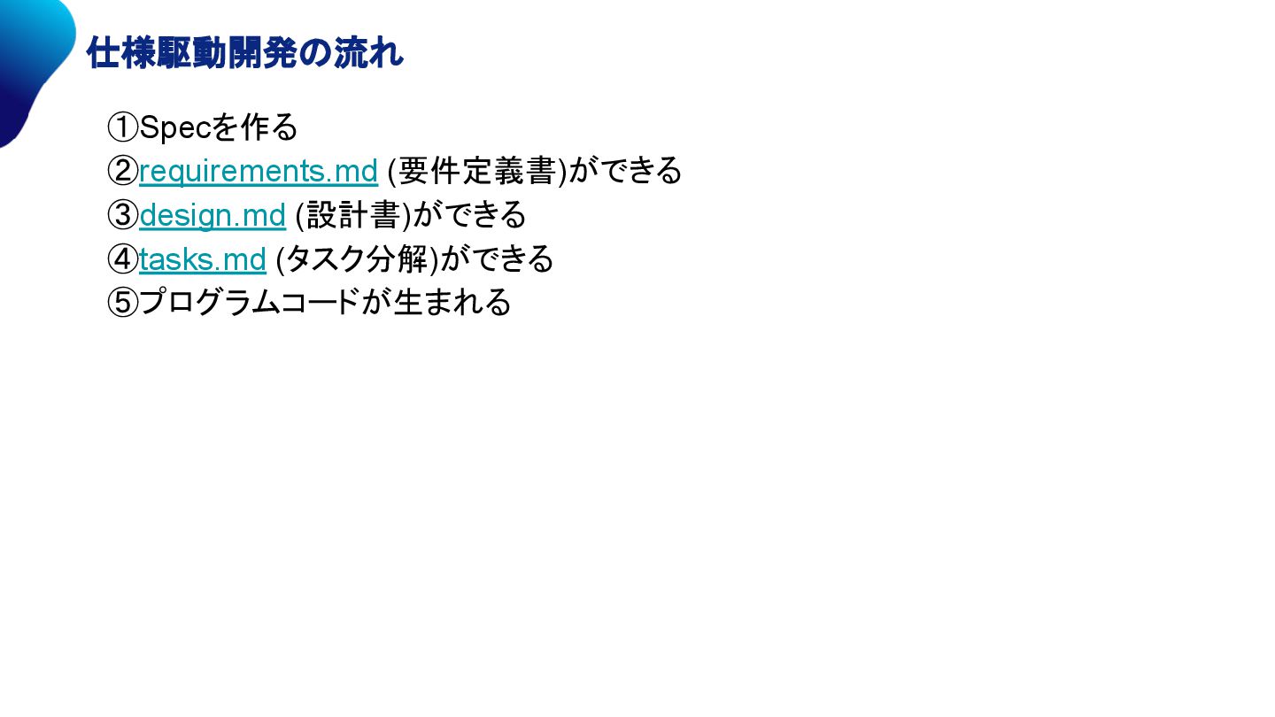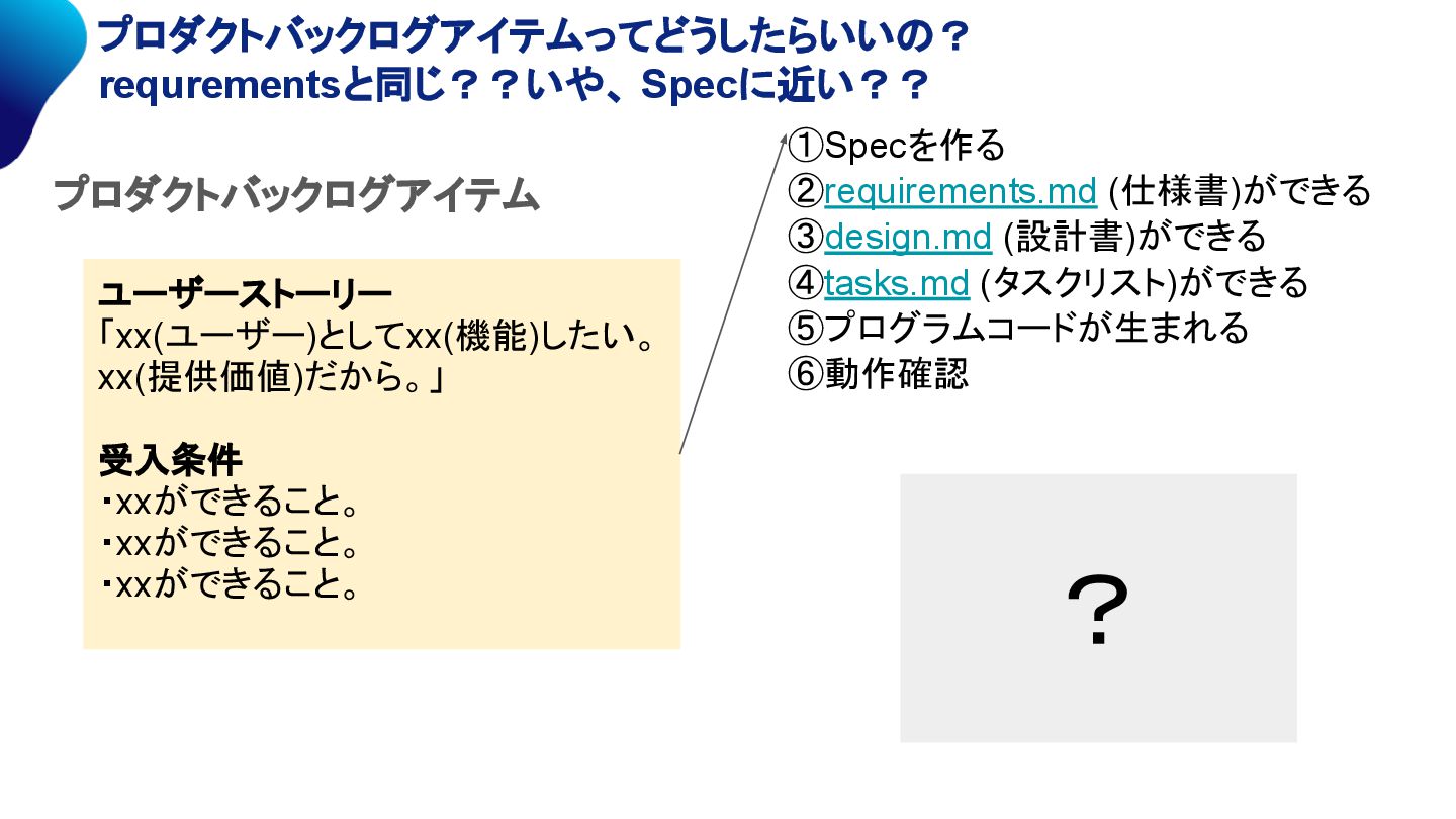 ①Specを作る ②requirements.md (仕様書)ができる ③design.md (設計書)ができる ④tasks.md (タスクリスト)ができる ⑤プログラムコードが生まれる ⑥動作確認 ? プロダクトバックログアイテム