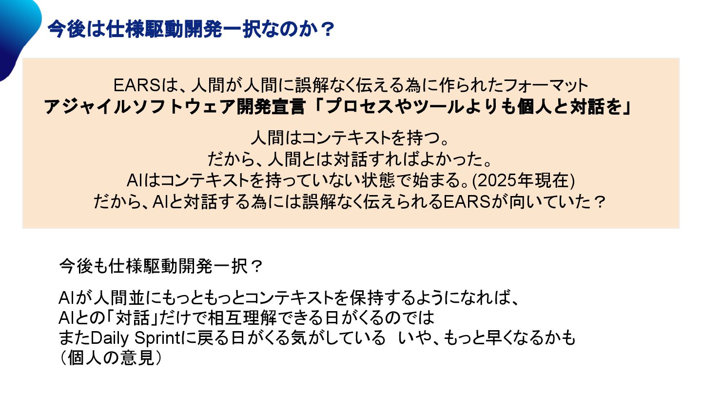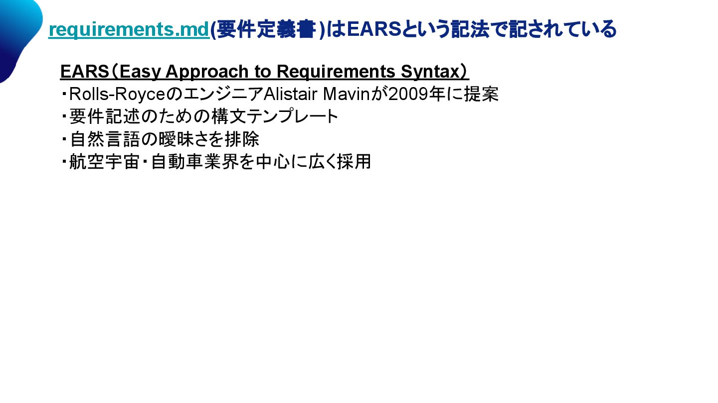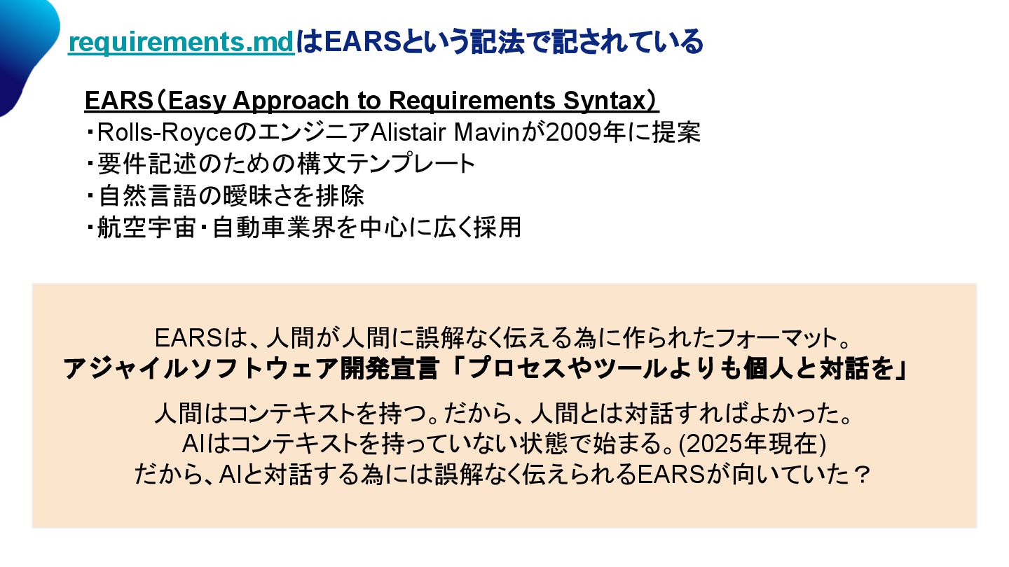 ・航空宇宙・自動車業界を中心に広く採用 EARSは、人間が人間に誤解なく伝える為に作られたフォーマット。 アジャイルソフトウェア開発宣言「プロセスやツールよりも個人と対話を」 人間はコンテキストを持つ。だから、人間とは対話すればよかった。 AIはコンテキストを持っていない状態で始まる。(2025年現在) だから、AIと対話する為には誤解なく伝えられるEARSが向いていた?