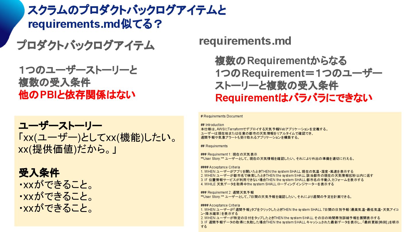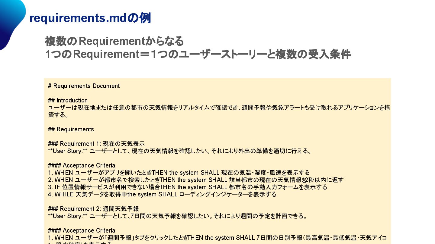 週間予報や気象アラートも受け取れるアプリケーションを構築する。 ## Requirements ### Requirement 1: 現在の天気表示 **User Story:** ユーザーとして、現在の天気情報を確認したい。それにより外出の準備を適切に行える。 #### Acceptance Criteria 1. WHEN ユーザーがアプリを開いたとき THEN the system SHALL 現在の気温・湿度・風速を表示する 2. WHEN ユーザーが都市名で検索したとき THEN the system SHALL 該当都市の現在の天気情報を 2秒以内に返す 3. IF 位置情報サービスが利用できない場合 THEN the system SHALL 都市名の手動入力フォームを表示する 4. WHILE 天気データを取得中 the system SHALL ローディングインジケーターを表示する ### Requirement 2: 週間天気予報 **User Story:** ユーザーとして、7日間の天気予報を確認したい。それにより週間の予定を計画できる。 #### Acceptance Criteria 1. WHEN ユーザーが「週間予報」タブをクリックしたとき THEN the system SHALL 7日間の日別予報(最高気温・最低気温・天気アイコ ン・降水確率)を表示する 2. WHEN ユーザーが特定の日付をタップしたとき THEN the system SHALL その日の時間帯別詳細予報を展開表示する 3. IF 週間予報データの取得に失敗した場合 THEN the system SHALL キャッシュされた最新データを表示し、「最終更新 : [時刻]」を明示 する requirements.md ユーザーストーリー 「xx(ユーザー)としてxx(機能)したい。 xx(提供価値)だから。」 受入条件 ・xxができること。 ・xxができること。 ・xxができること。 プロダクトバックログアイテム 複数のRequirementからなる 1つのRequirement=1つのユーザー ストーリーと複数の受入条件 Requirementはバラバラにできない 1つのユーザーストーリーと 複数の受入条件 他のPBIと依存関係はない