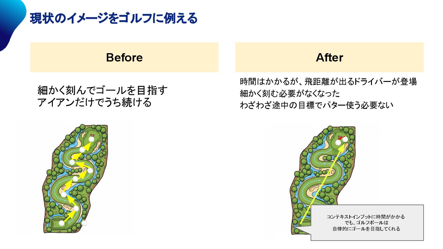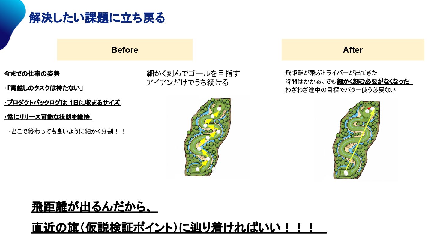 6. 解決したい課題に立ち戻る 細かく刻んでゴールを目指す アイアンだけでうち続ける Before After 飛距離が飛ぶドライバーが出てきた 時間はかかる。でも 細かく刻む必要がなくなった わざわざ途中の目標でパター使う必要ない 今までの仕事の姿勢