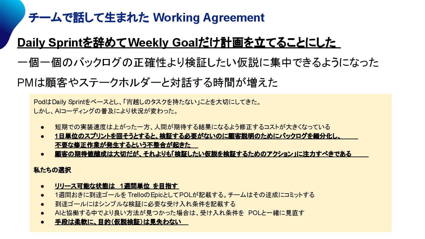 不要な修正作業が発生するという不整合が起きた • 顧客の期待値醸成は大切だが、それよりも「検証したい仮説を検証するためのアクション」に注力すべきである 私たちの選択 • リリース可能な状態は 1週間単位 を目指す • 1週間おきに到達ゴールを TrelloのEpicとしてPOLが記載する。チームはその達成にコミットする • 到達ゴールにはシンプルな検証に必要な受け入れ条件を記載する • AIと協働する中でより良い方法が見つかった場合は、受け入れ条件を POLと一緒に見直す • 手段は柔軟に、目的(仮説検証)は見失わない Daily Sprintを辞めてWeekly Goalだけ計画を立てることにした 一個一個のバックログの正確性より検証したい仮説に集中できるようになった PMは顧客やステークホルダーと対話する時間が増えた