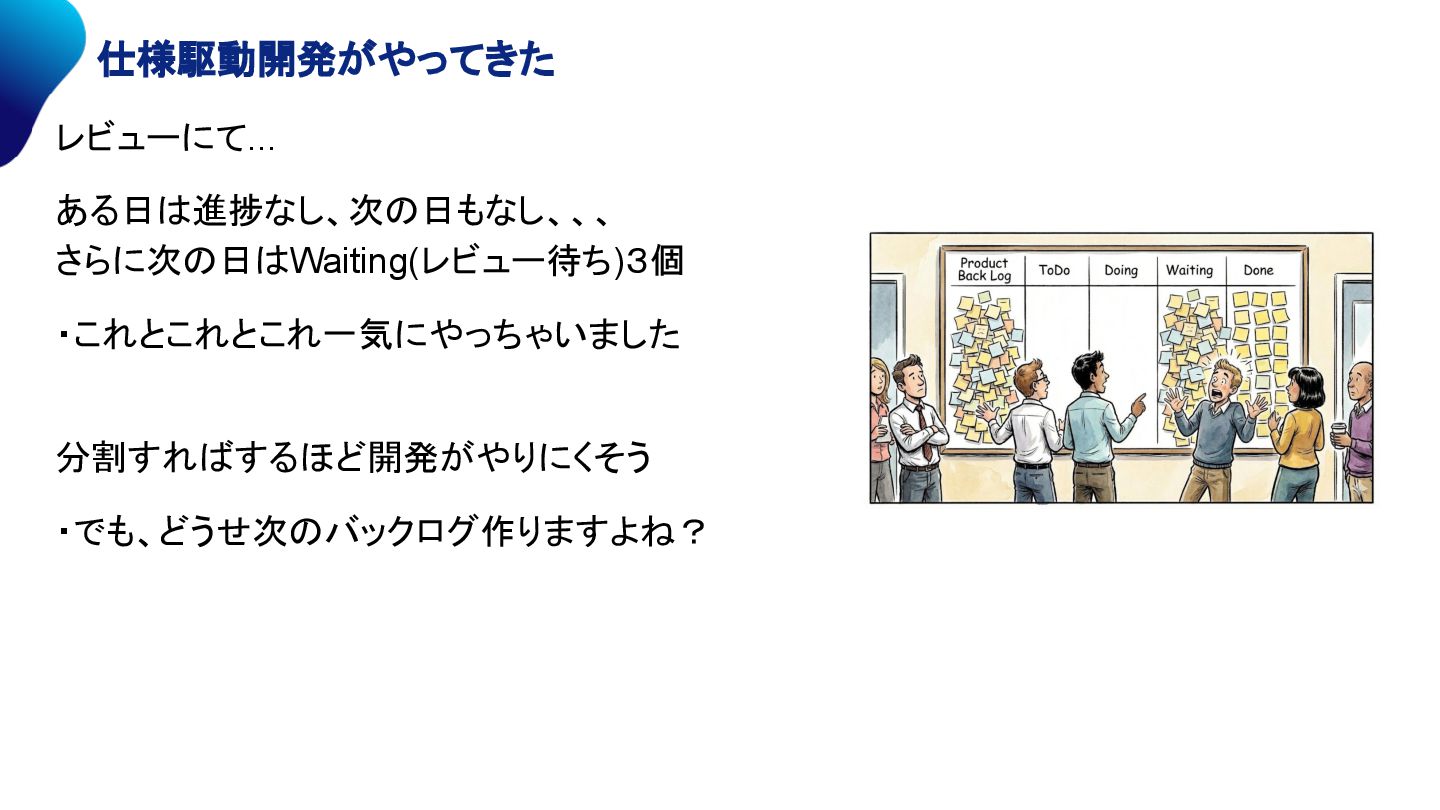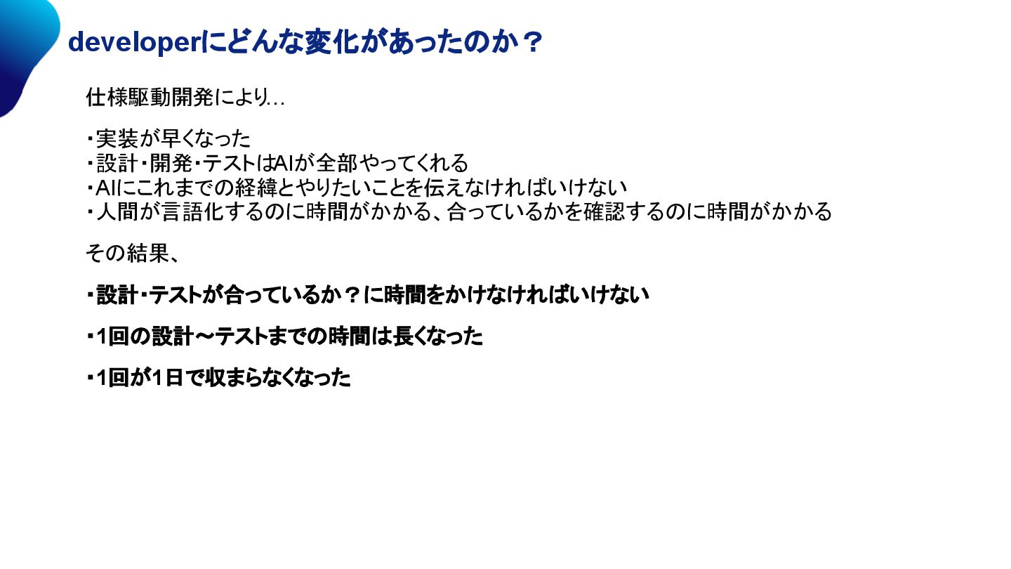 大きい (意図とずれやすい) 小さい (仕様に沿った結果) 追跡性 困難 仕様書が残る 実装の追跡ができる