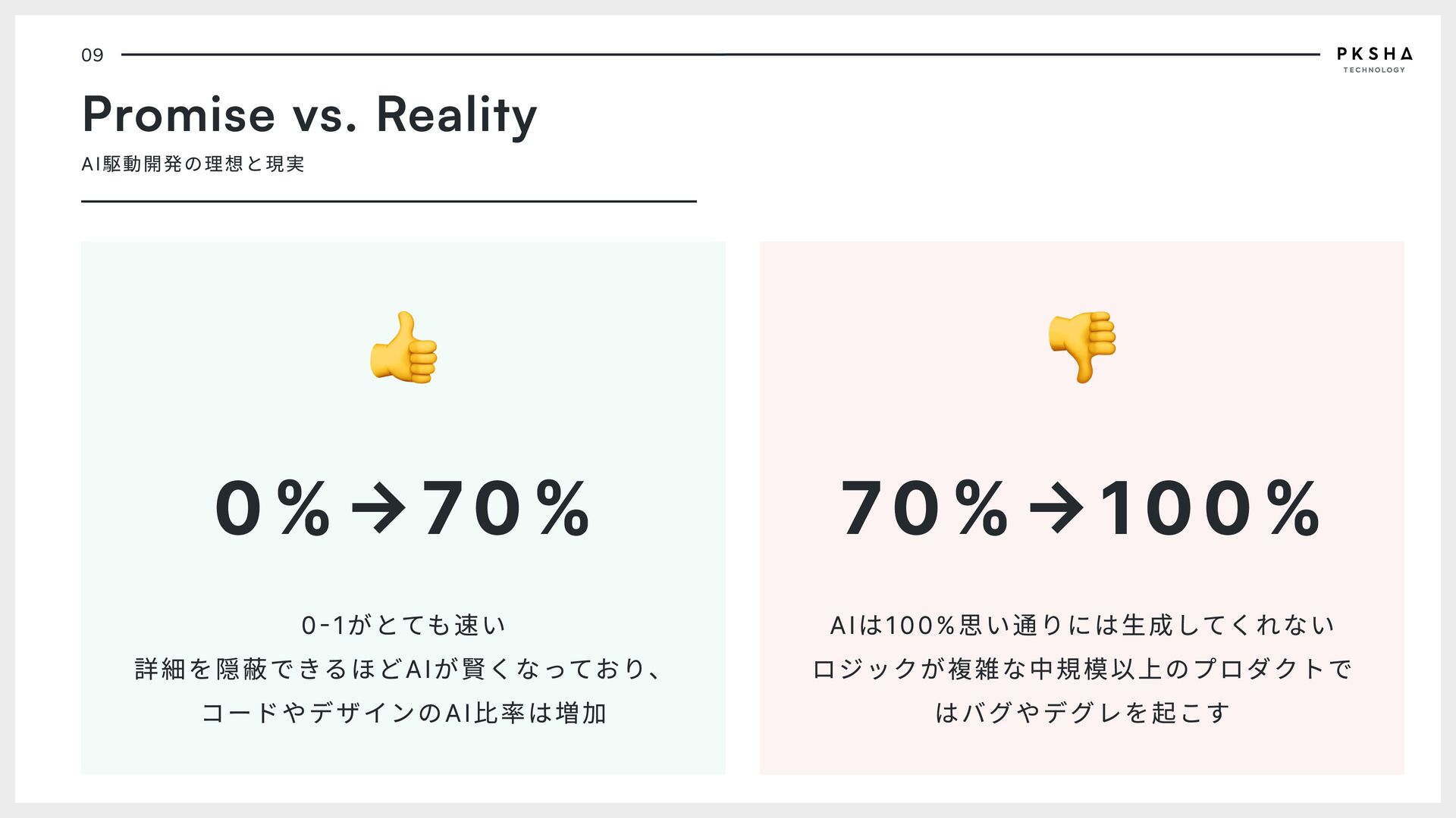 6. 09 Promise vs. Reality AI駆動開発の理想と現実 0%→70% 0-1がとても速い 詳細を隠蔽できるほどAIが賢くなっており、 コードやデザインのAI比率は増加 70%→100%