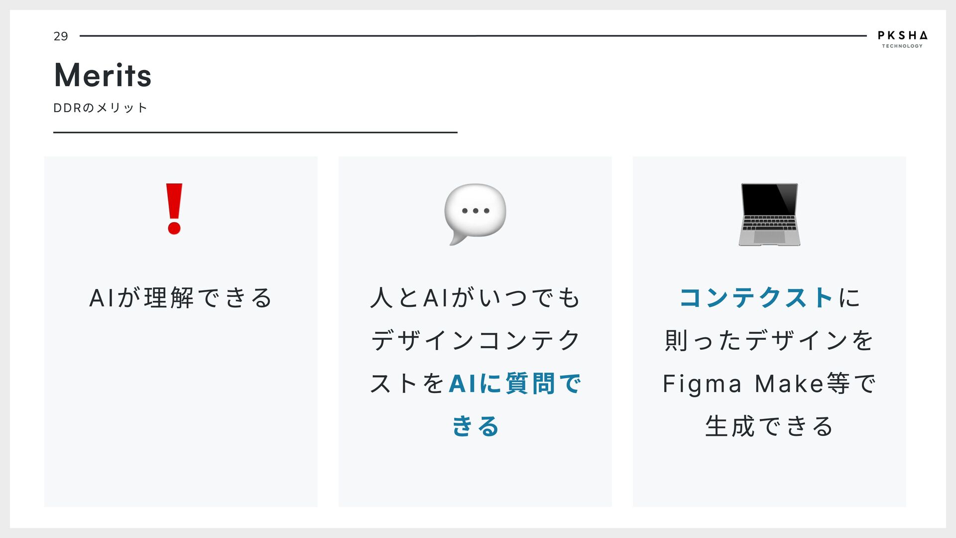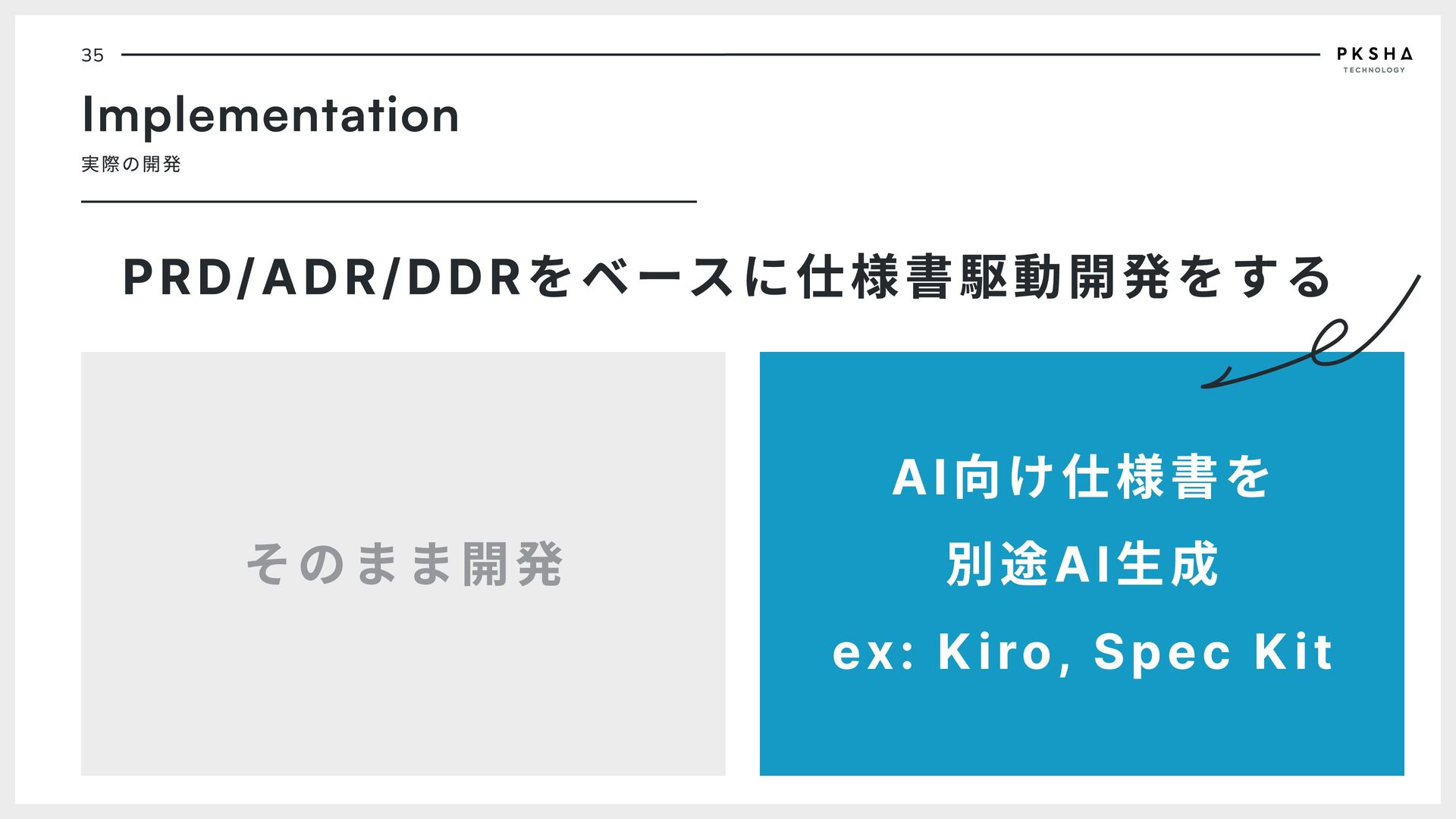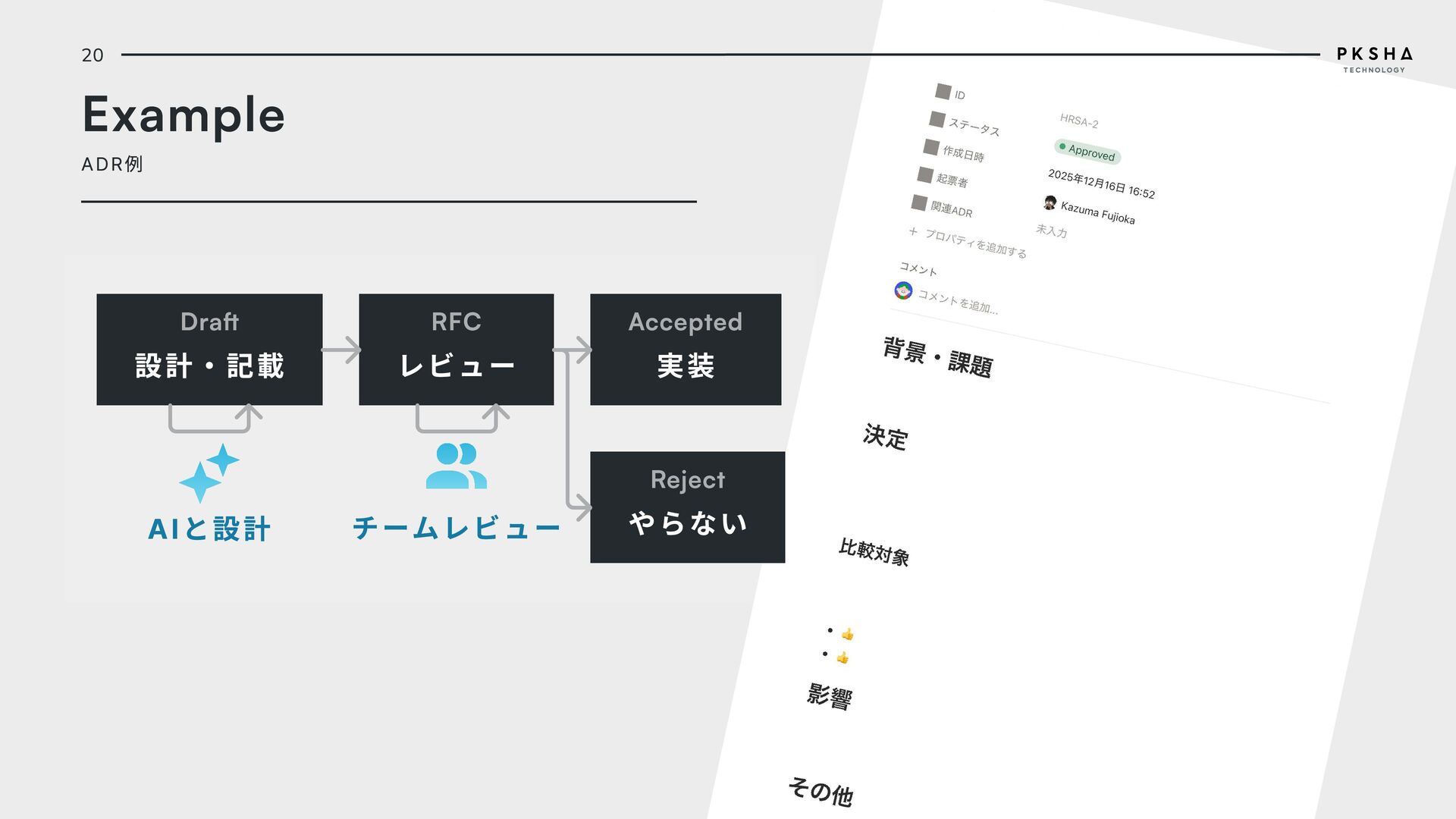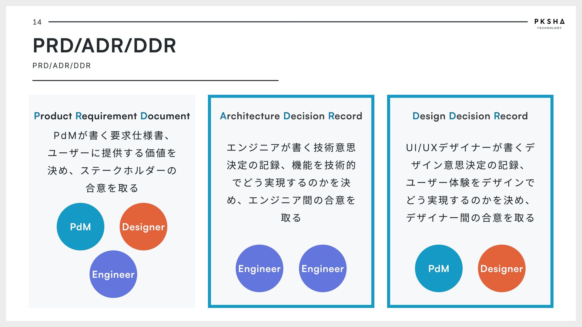 ユーザーに提供する価値を 決め、ステークホルダーの 合意を取る PdM Designer Engineer A D R rchitecture ecision ecord エンジニアが書く技術意思 決定の記録、機能を技術的 でどう実現するのかを決 め、エンジニア間の合意を 取る Engineer Engineer D D R esign ecision ecord UI/UXデザイナーが書くデ ザイン意思決定の記録、 ユーザー体験をデザインで どう実現するのかを決め、 デザイナー間の合意を取る PdM Designer