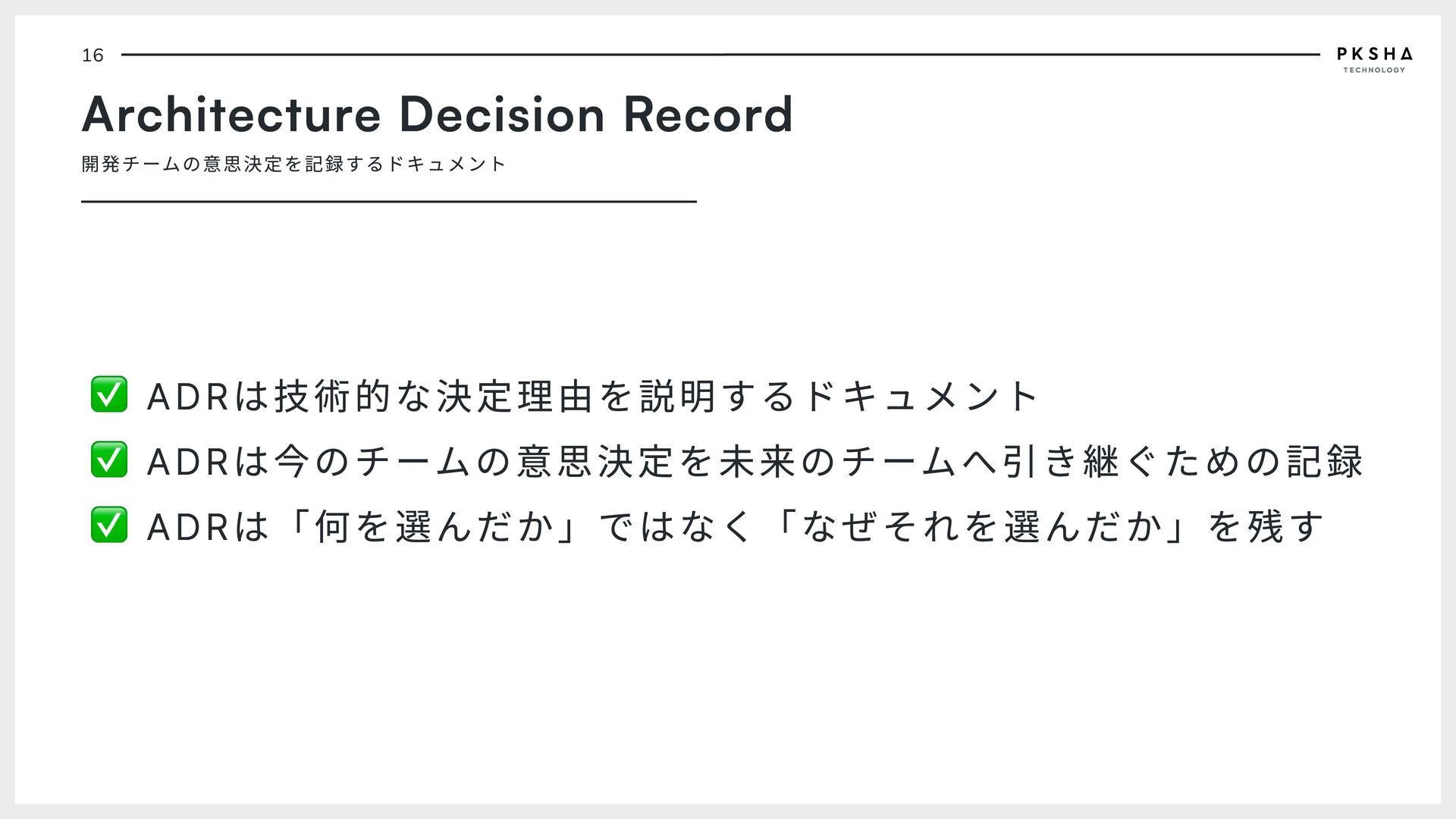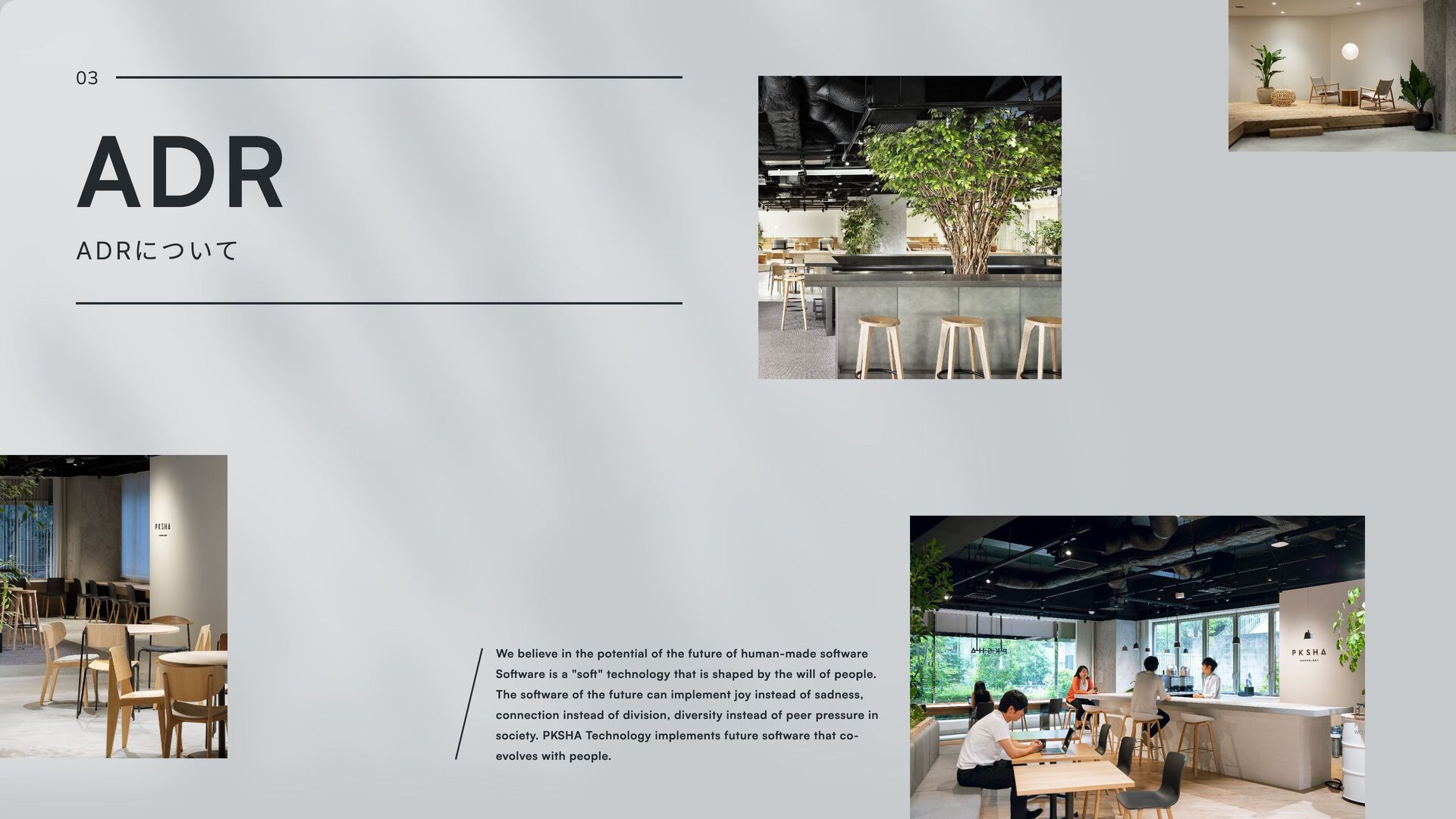 software Software is a "soft" technology that is shaped by the will of people. The software of the future can implement joy instead of sadness, connection instead of division, diversity instead of peer pressure in society. PKSHA Technology implements future software that co- evolves with people. 03 ADR ADRについて