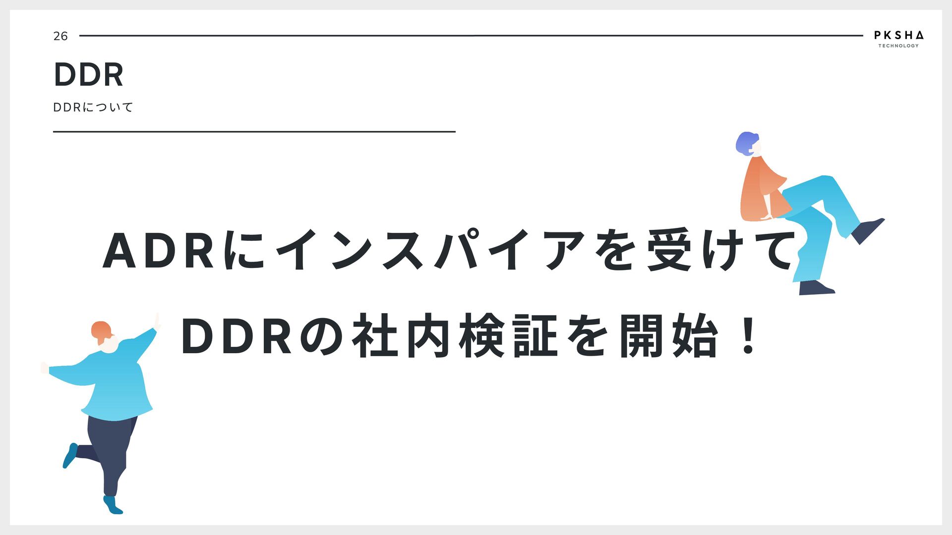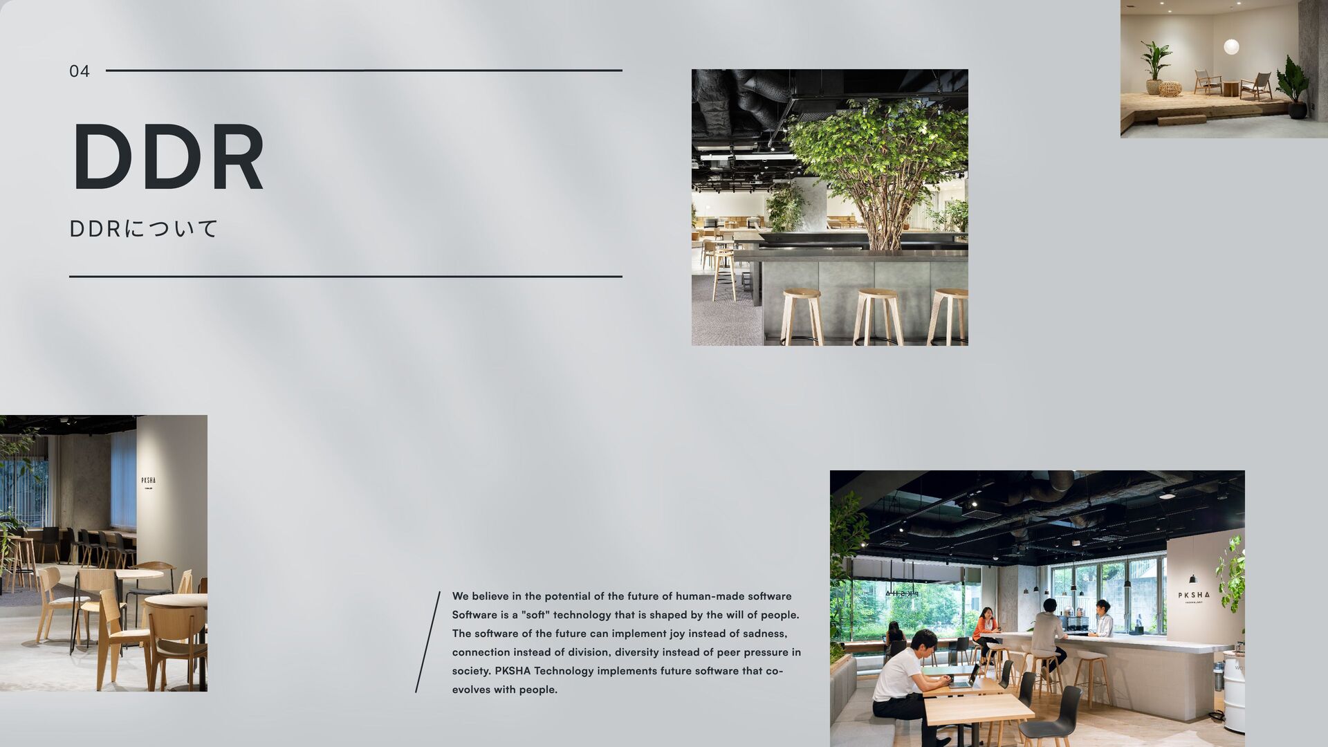 software Software is a "soft" technology that is shaped by the will of people. The software of the future can implement joy instead of sadness, connection instead of division, diversity instead of peer pressure in society. PKSHA Technology implements future software that co- evolves with people. 04 DDR DDRについて