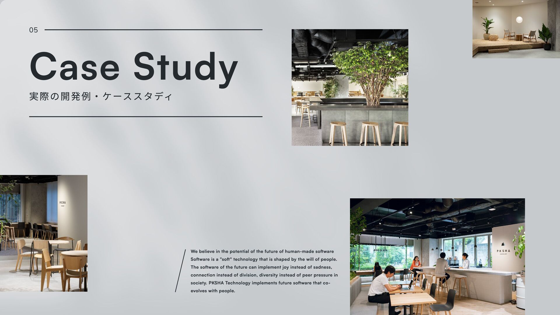 software Software is a "soft" technology that is shaped by the will of people. The software of the future can implement joy instead of sadness, connection instead of division, diversity instead of peer pressure in society. PKSHA Technology implements future software that co- evolves with people. 05 Case Study 実際の開発例・ケーススタディ