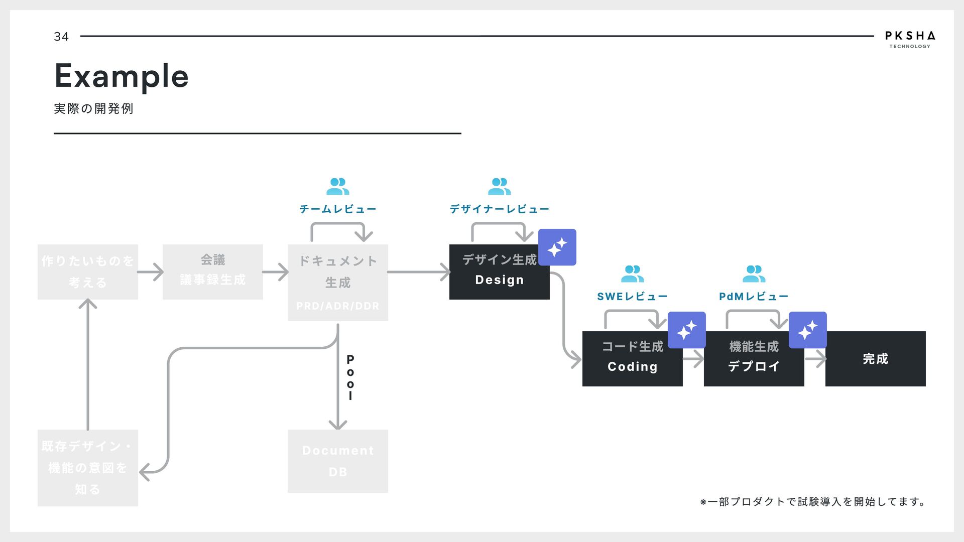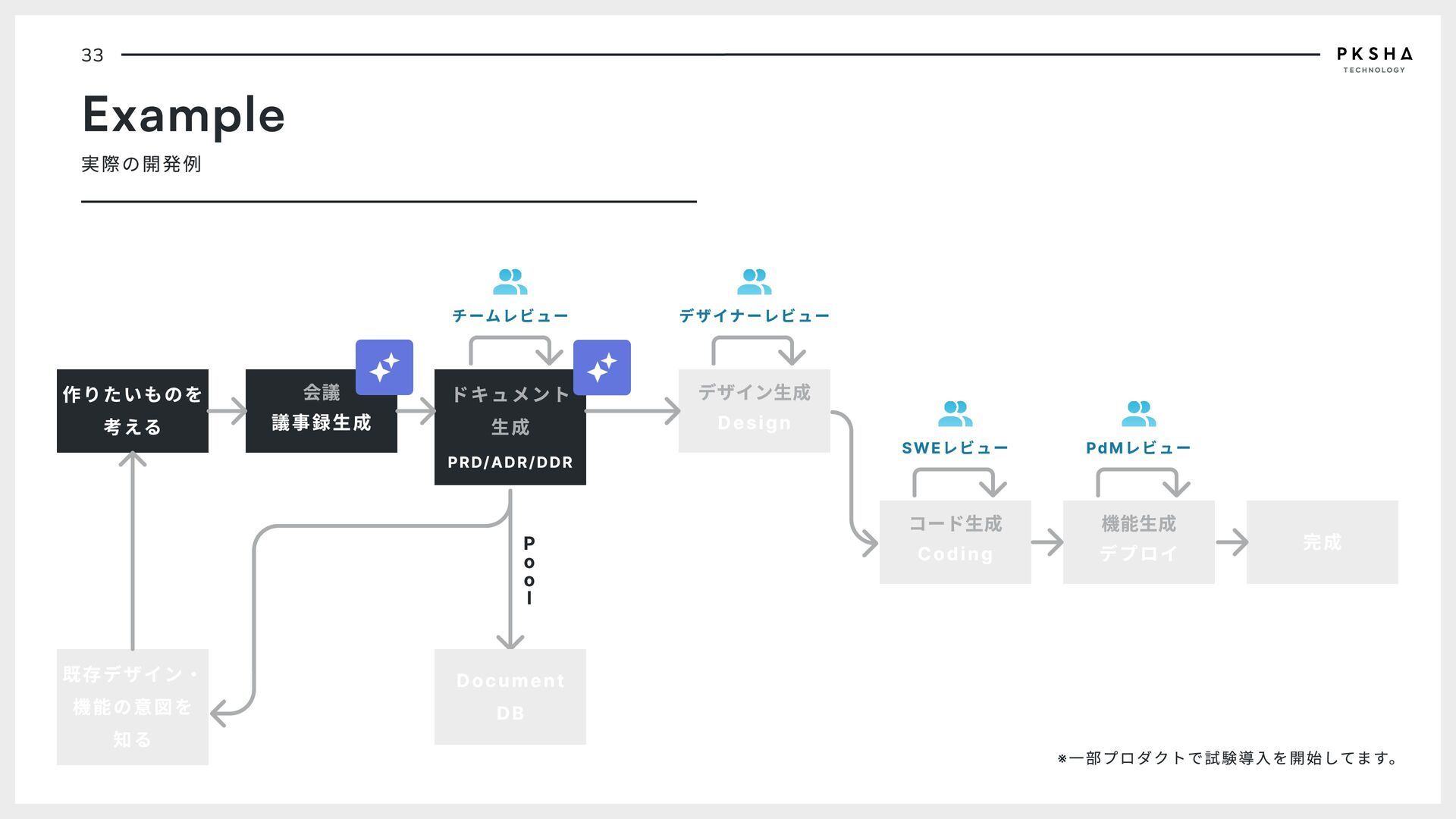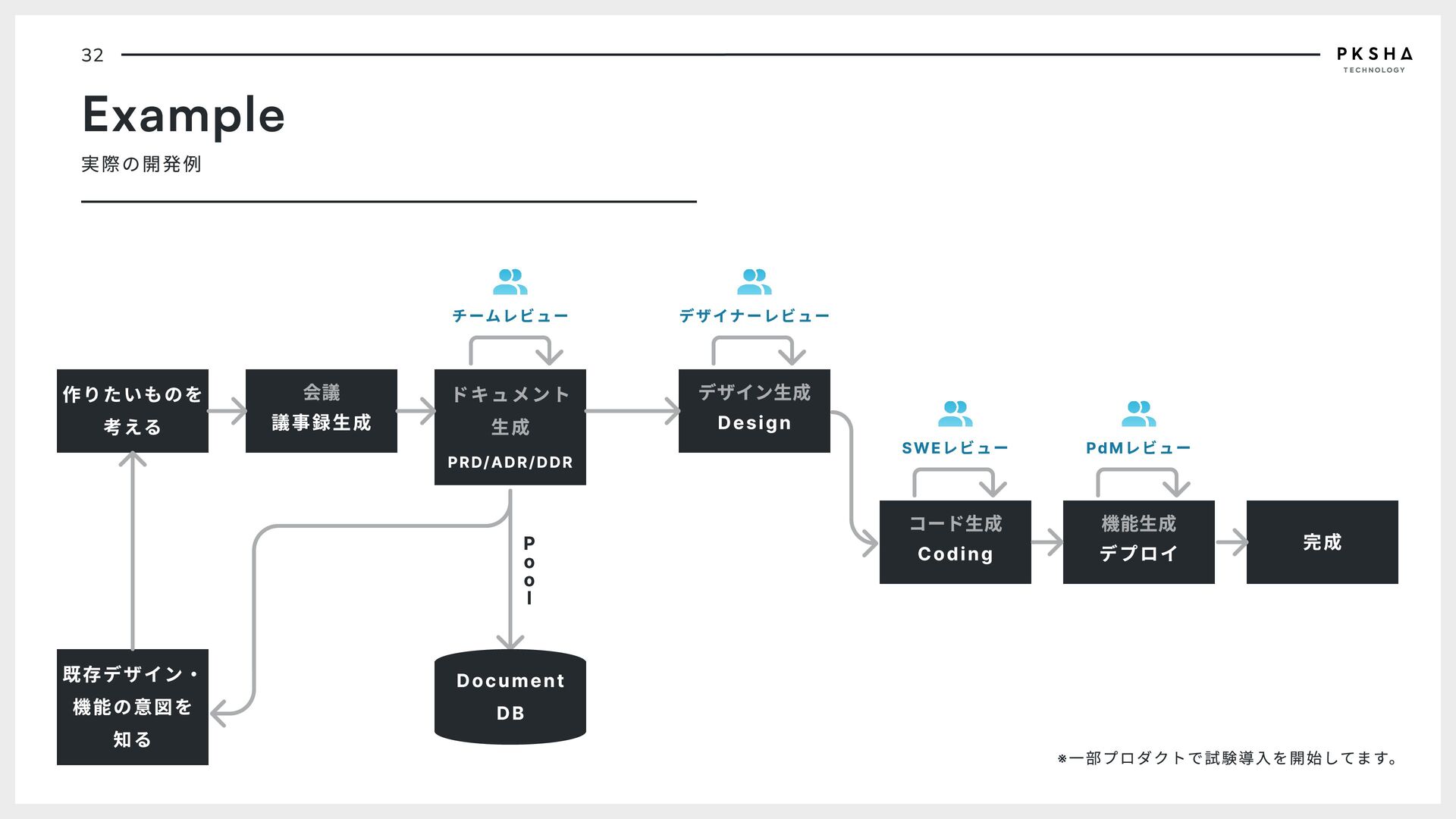o o l 完成 コード生成 Coding 機能生成 デプロイ ドキュメント 生成 PRD/ADR/DDR 既存デザイン・ 機能の意図を 知る チームレビュー デザイナーレビュー SWEレビュー PdMレビュー Document DB ※一部プロダクトで試験導入を開始してます。