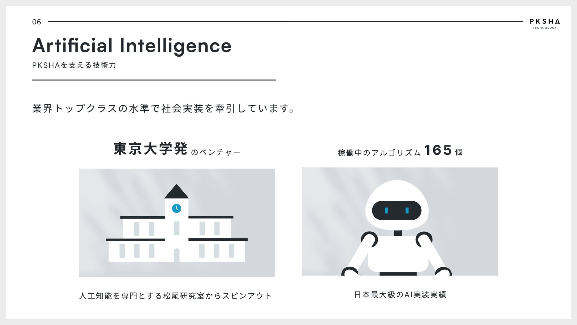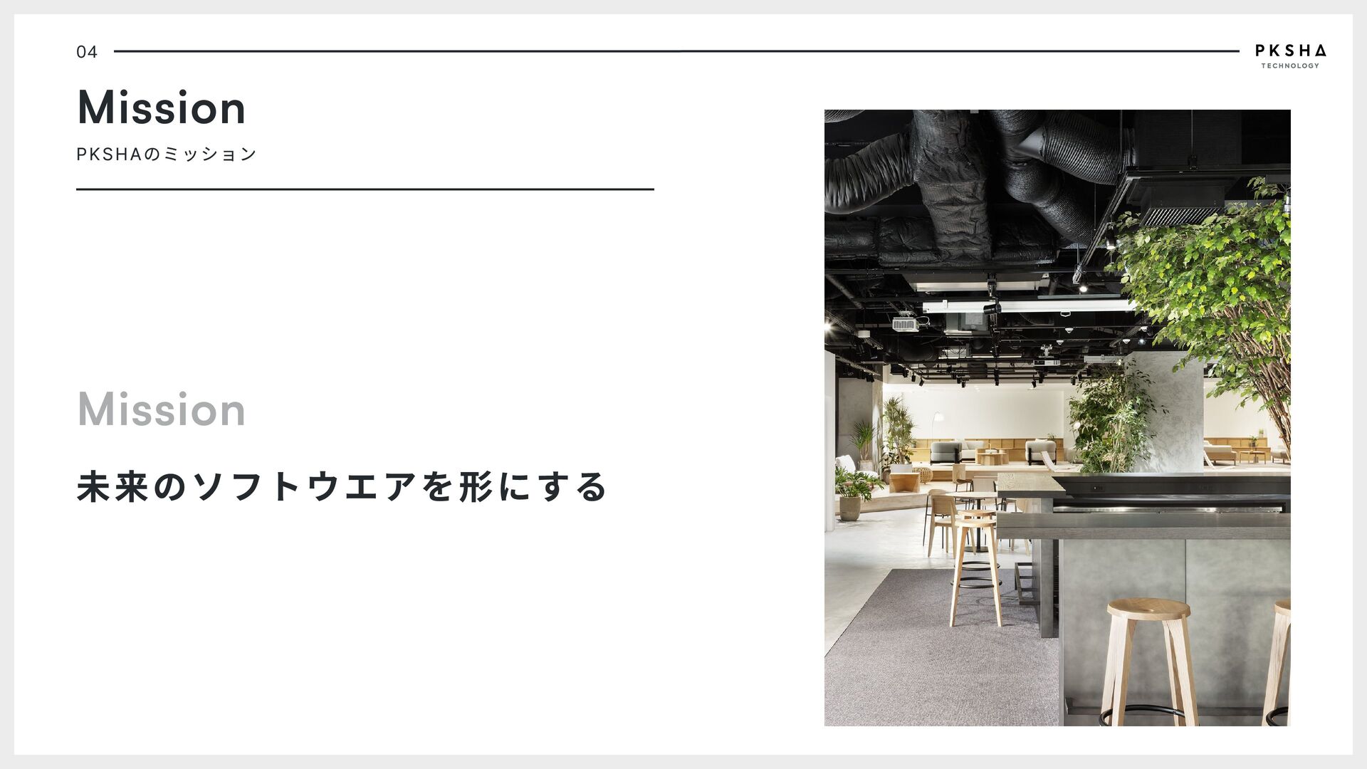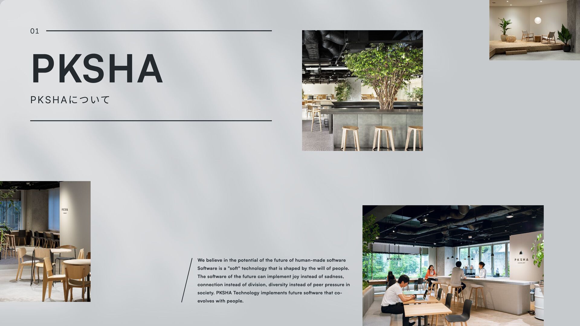 software Software is a "soft" technology that is shaped by the will of people. The software of the future can implement joy instead of sadness, connection instead of division, diversity instead of peer pressure in society. PKSHA Technology implements future software that co- evolves with people. 01 PKSHA PKSHAについて