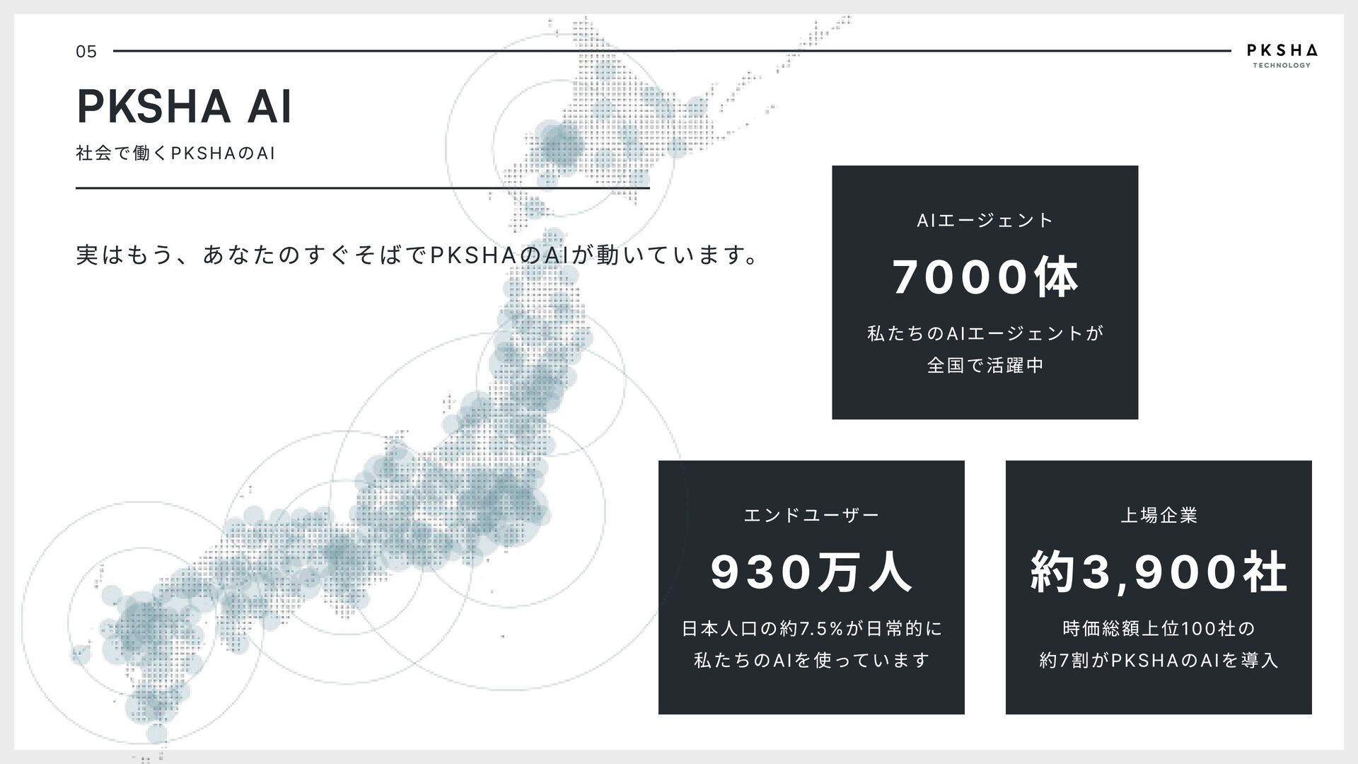 4. 05 PKSHA AI 社会で働くPKSHAのAI AIエージェント 7000体 私たちのAIエージェントが 全国で活躍中 エンドユーザー 930万人