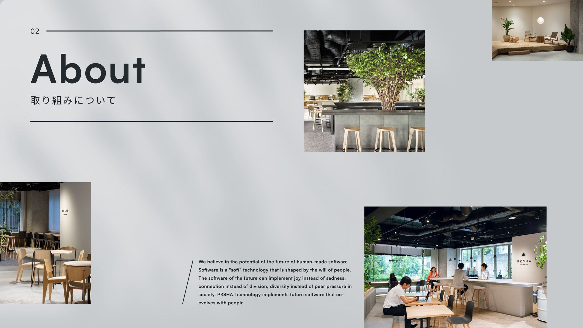 software Software is a "soft" technology that is shaped by the will of people. The software of the future can implement joy instead of sadness, connection instead of division, diversity instead of peer pressure in society. PKSHA Technology implements future software that co- evolves with people. 02 About 取り組みについて