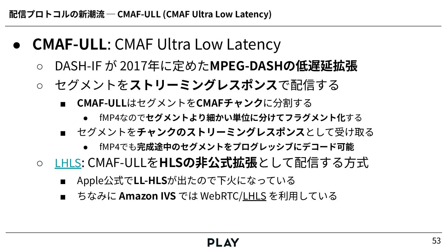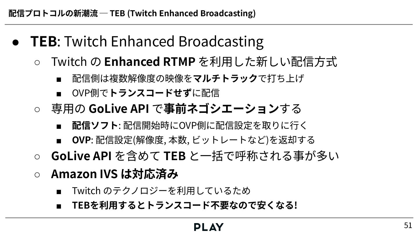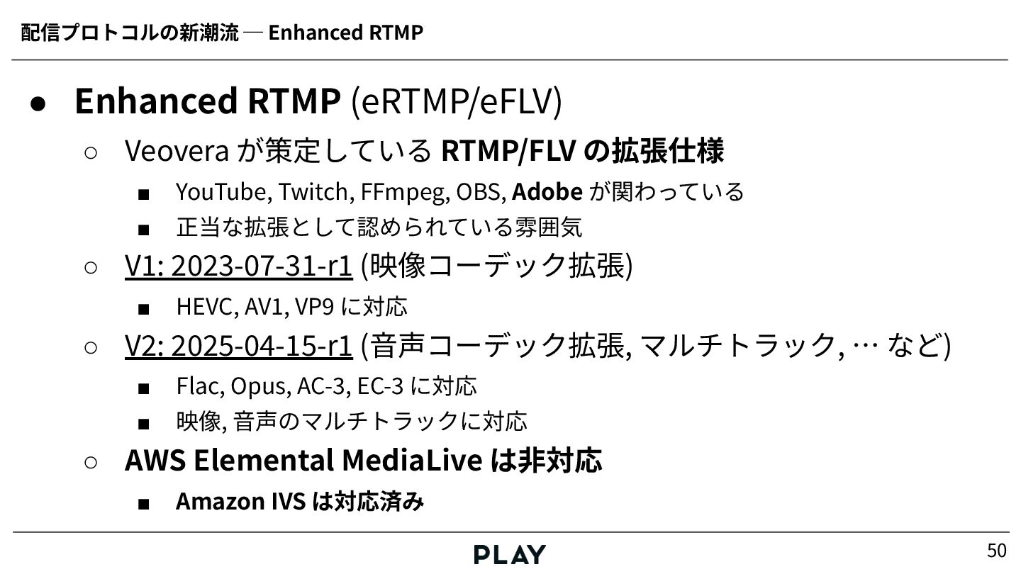 が策定している RTMP/FLV の拡張仕様 ▪ YouTube, Twitch, FFmpeg, OBS, Adobe が関わっている ▪ 正当な拡張として認められている雰囲気 ◦ V1: 2023-07-31-r1 (映像コーデック拡張) ▪ HEVC, AV1, VP9 に対応 ◦ V2: 2025-04-15-r1 (⾳声コーデック拡張, マルチトラック, … など) ▪ Flac, Opus, AC-3, EC-3 に対応 ▪ 映像, ⾳声のマルチトラックに対応 ◦ AWS Elemental MediaLive は⾮対応 ▪ Amazon IVS は対応済み 50