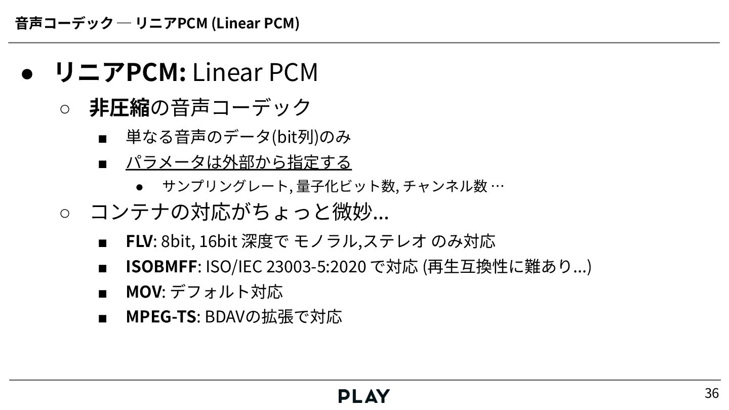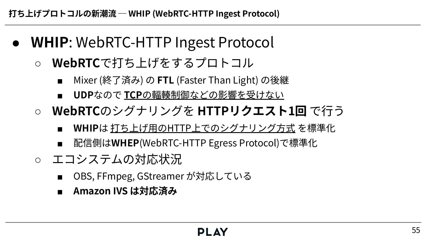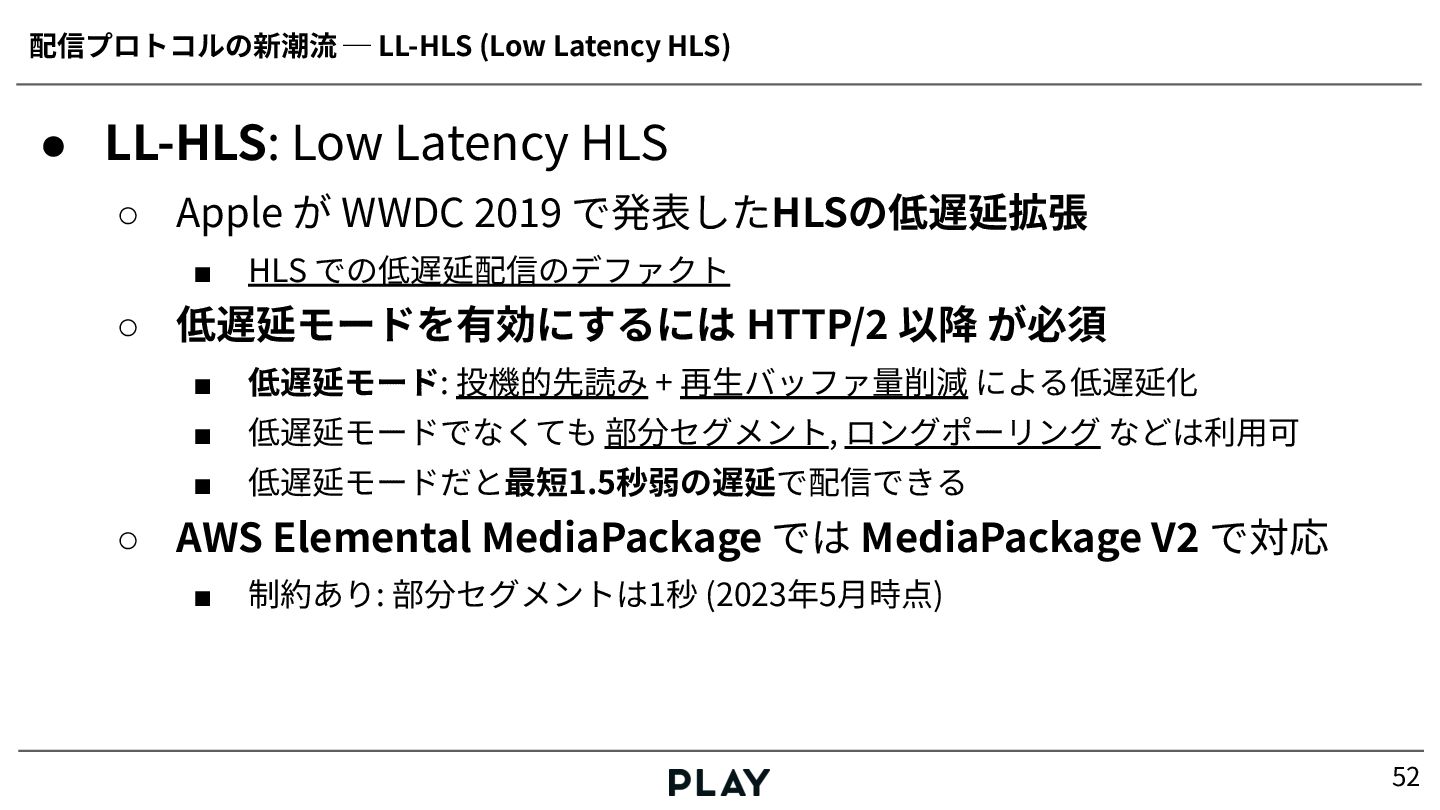 が策定している RTMP/FLV の拡張仕様 ▪ YouTube, Twitch, FFmpeg, OBS, Adobe が関わっている ▪ 正当な拡張として認められている雰囲気 ◦ V1: 2023-07-31-r1 (映像コーデック拡張) ▪ HEVC, AV1, VP9 に対応 ◦ V2: 2025-04-15-r1 (⾳声コーデック拡張, マルチトラック, … など) ▪ Flac, Opus, AC-3, EC-3 に対応 ▪ 映像, ⾳声のマルチトラックに対応 ◦ AWS Elemental MediaLive は⾮対応 ▪ Amazon IVS は対応済み 50
