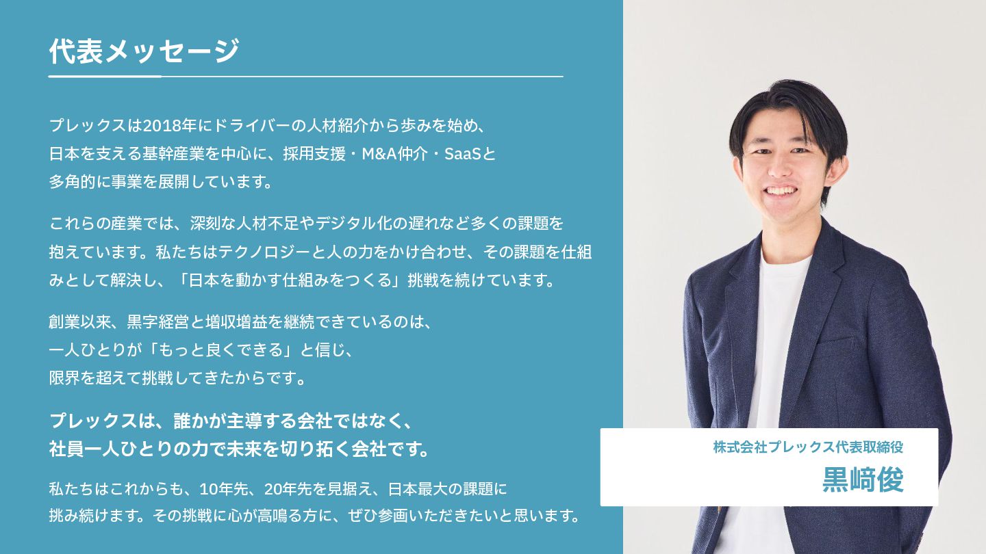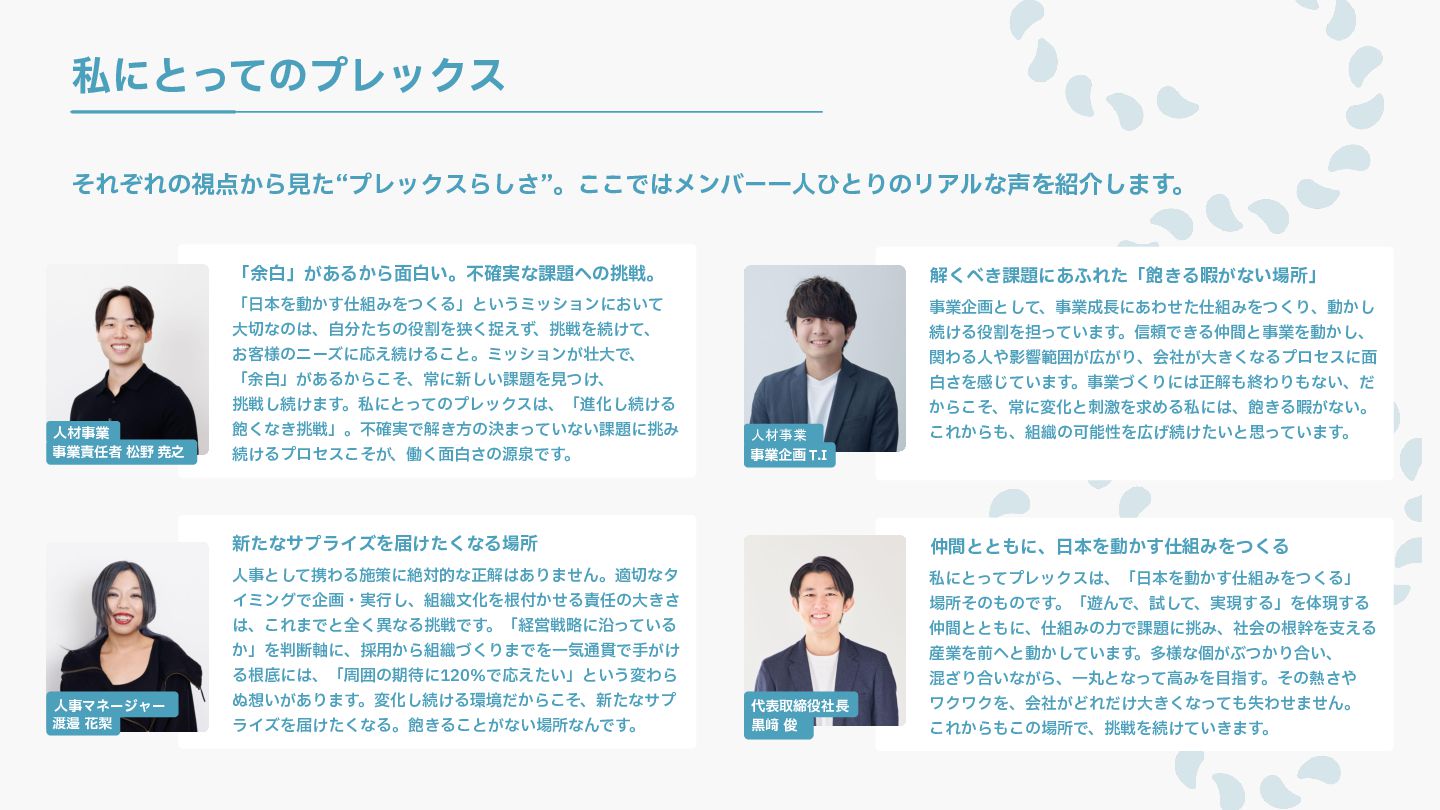 松野 尭之 ⼈材事業 事業企画として、事業成⻑にあわせた仕組みをつくり、動かし 続ける役割を担っています。信頼できる仲間と事業を動かし、 関わる⼈や影響範囲が広がり、会社が⼤きくなるプロセスに⾯ ⽩さを感じています。事業づくりには正解も終わりもない、だ からこそ、常に変化と刺激を求める私には、飽きる暇がない。 これからも、組織の可能性を広げ続けたいと思っています。 解くべき課題にあふれた「飽きる暇がない場所」 私にとってプレックスは、「⽇本を動かす仕組みをつくる」 場所そのものです。「遊んで、試して、実現する」を体現する 仲間とともに、仕組みの⼒で課題に挑み、社会の根幹を⽀える 産業を前へと動かしています。多様な個がぶつかり合い、 混ざり合いながら、⼀丸となって⾼みを⽬指す。その熱さや ワクワクを、会社がどれだけ⼤きくなっても失わせません。 これからもこの場所で、挑戦を続けていきます。 仲間とともに、⽇本を動かす仕組みをつくる 私にとってのプレックス ⼈事として携わる施策に絶対的な正解はありません。適切なタ イミングで企画・実⾏し、組織⽂化を根付かせる責任の⼤きさ は、これまでと全く異なる挑戦です。「経営戦略に沿っている か」を判断軸に、採⽤から組織づくりまでを⼀気通貫で⼿がけ る根底には、「周囲の期待に120%で応えたい」という変わら ぬ想いがあります。変化し続ける環境だからこそ、新たなサプ ライズを届けたくなる。飽きることがない場所なんです。 新たなサプライズを届けたくなる場所 渡邉 花梨 ⿊﨑 俊 代表取締役社⻑ ⼈事マネージャー 人材事業 事業企画 T.I