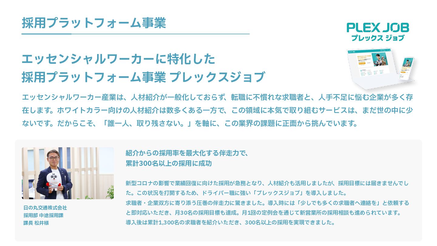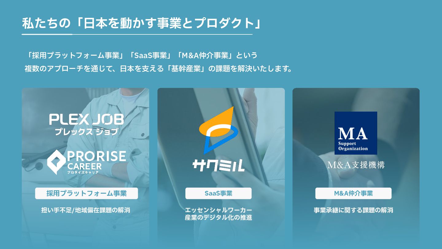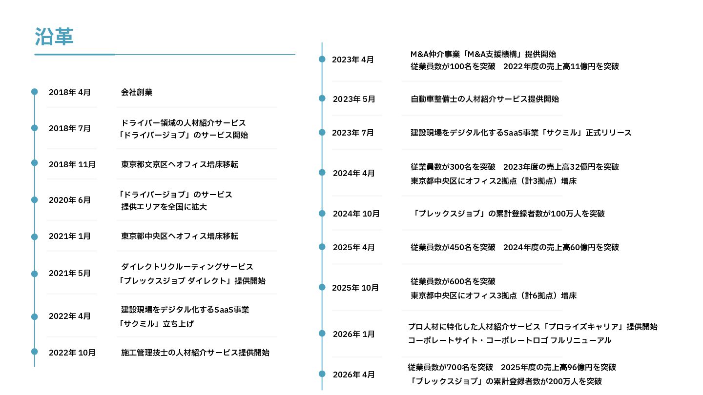 2020年 6⽉ 「ドライバージョブ」のサービス 提供エリアを全国に拡⼤ 2021年 1⽉ 東京都中央区へオフィス増床移転 ダイレクトリクルーティングサービス 「プレックスジョブ ダイレクト」提供開始 2021年 5⽉ 建設現場をデジタル化するSaaS事業 「サクミル」⽴ち上げ 2022年 4⽉ 施⼯管理技⼠の⼈材紹介サービス提供開始 2022年 10⽉ 沿⾰ 2023年 4⽉ M&A仲介事業「M&A⽀援機構」提供開始 従業員数が100名を突破 2022年度の売上⾼11億円を突破 2023年 5⽉ ⾃動⾞整備⼠の⼈材紹介サービス提供開始 2024年 4⽉ 従業員数が300名を突破 2023年度の売上⾼32億円を突破 東京都中央区にオフィス2拠点(計3拠点)増床 建設現場をデジタル化するSaaS事業「サクミル」正式リリース 2023年 7⽉ 「プレックスジョブ」の累計登録者数が100万⼈を突破 2024年 10⽉ 従業員数が450名を突破 2024年度の売上⾼60億円を突破 2025年 4⽉ 従業員数が600名を突破 東京都中央区にオフィス3拠点(計6拠点)増床 2025年 10⽉ プロ⼈材に特化した⼈材紹介サービス「プロライズキャリア」提供開始 コーポレートサイト・コーポレートロゴ フルリニューアル 2026年 1⽉ 従業員数が700名を突破 2025年度の売上⾼96億円を突破 「プレックスジョブ」の累計登録者数が200万⼈を突破 2026年 4⽉
