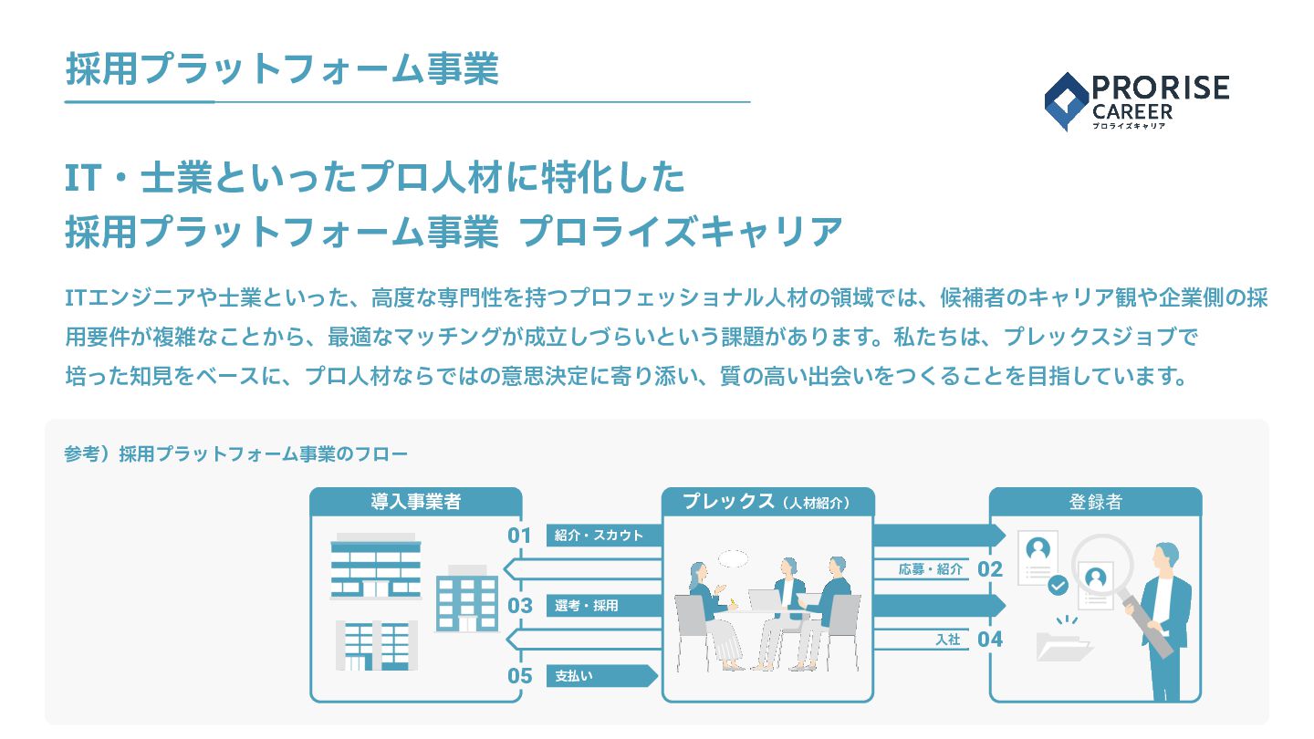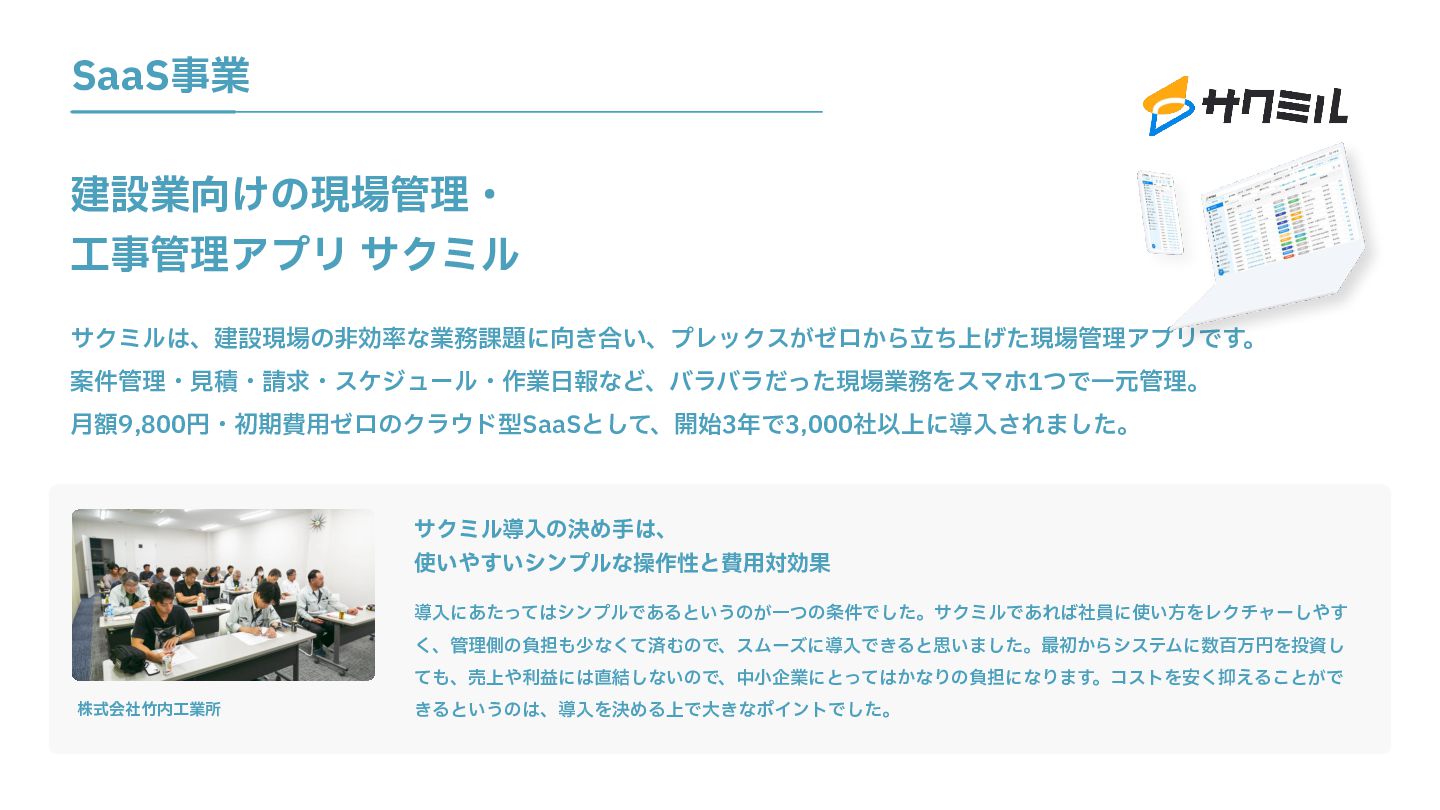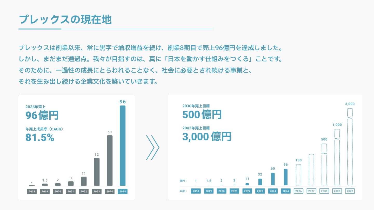 2020年 6⽉ 「ドライバージョブ」のサービス 提供エリアを全国に拡⼤ 2021年 1⽉ 東京都中央区へオフィス増床移転 ダイレクトリクルーティングサービス 「プレックスジョブ ダイレクト」提供開始 2021年 5⽉ 建設現場をデジタル化するSaaS事業 「サクミル」⽴ち上げ 2022年 4⽉ 施⼯管理技⼠の⼈材紹介サービス提供開始 2022年 10⽉ 沿⾰ 2023年 4⽉ M&A仲介事業「M&A⽀援機構」提供開始 従業員数が100名を突破 2022年度の売上⾼11億円を突破 2023年 5⽉ ⾃動⾞整備⼠の⼈材紹介サービス提供開始 2024年 4⽉ 従業員数が300名を突破 2023年度の売上⾼32億円を突破 東京都中央区にオフィス2拠点(計3拠点)増床 建設現場をデジタル化するSaaS事業「サクミル」正式リリース 2023年 7⽉ 「プレックスジョブ」の累計登録者数が100万⼈を突破 2024年 10⽉ 従業員数が450名を突破 2024年度の売上⾼60億円を突破 2025年 4⽉ 従業員数が600名を突破 東京都中央区にオフィス3拠点(計6拠点)増床 2025年 10⽉ プロ⼈材に特化した⼈材紹介サービス「プロライズキャリア」提供開始 コーポレートサイト・コーポレートロゴ フルリニューアル 2026年 1⽉ 従業員数が700名を突破 2025年度の売上⾼96億円を突破 「プレックスジョブ」の累計登録者数が200万⼈を突破 2026年 4⽉