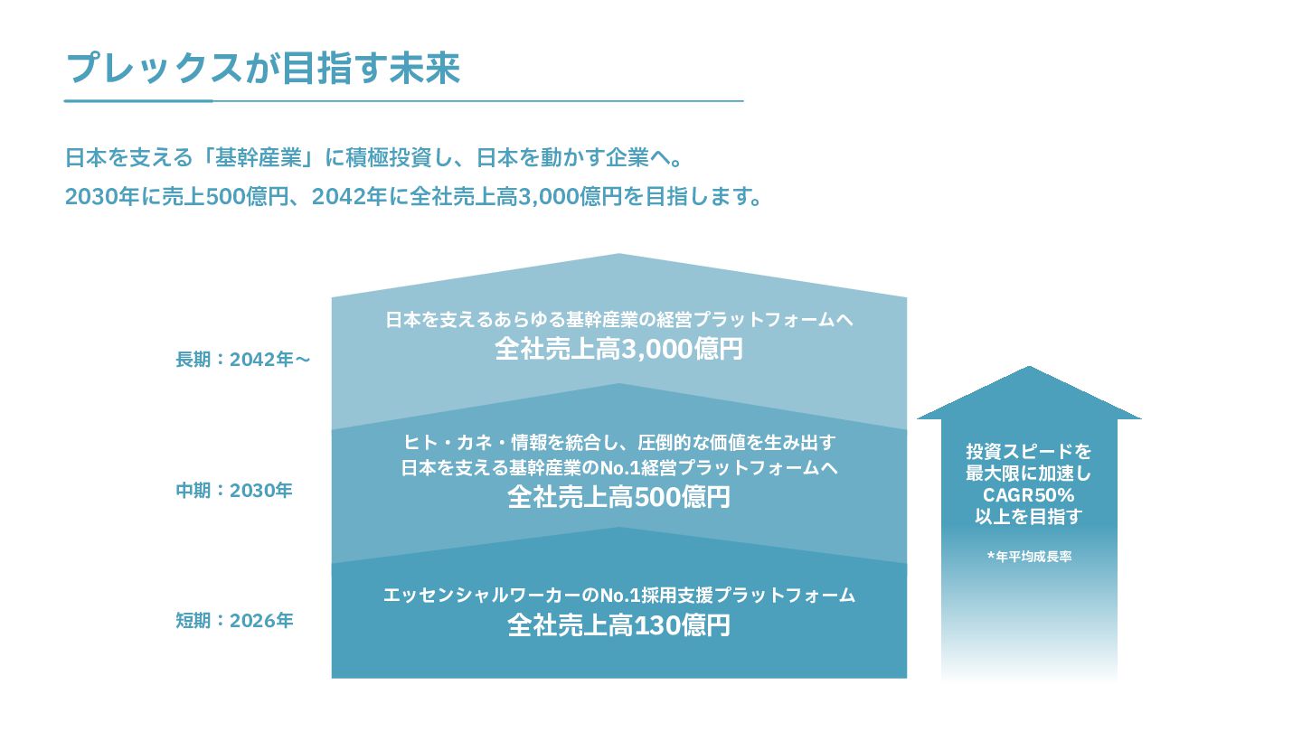 ヒト・カネ・情報を統合し、圧倒的な価値を⽣み出す ⽇本を⽀える基幹産業のNo.1経営プラットフォームへ 全社売上⾼500億円 エッセンシャルワーカーのNo.1採⽤⽀援プラットフォーム 全社売上⾼130億円 ⻑期:2042年〜 中期:2030年 短期:2026年