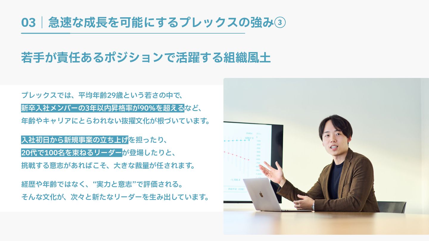 歳 平均年齢 16 拠点 拠点数 711 名 従業員数 185 % 従業員増加率 280 % 新卒メンバー増加率 ※2026年1⽉時点 データで⾒るプレックス プレックスは⼤きく成⻑していますが、まだこの勢いを⽌めるつもりはありません。 むしろ、成⻑している今だからこそ、新しい仕組みや価値を⼀緒につくっていける余⽩が多くあります。 ⾃分の⼒で事業や組織を動かしていける環境だからこそ、他社では得られない経験を積むことができます。