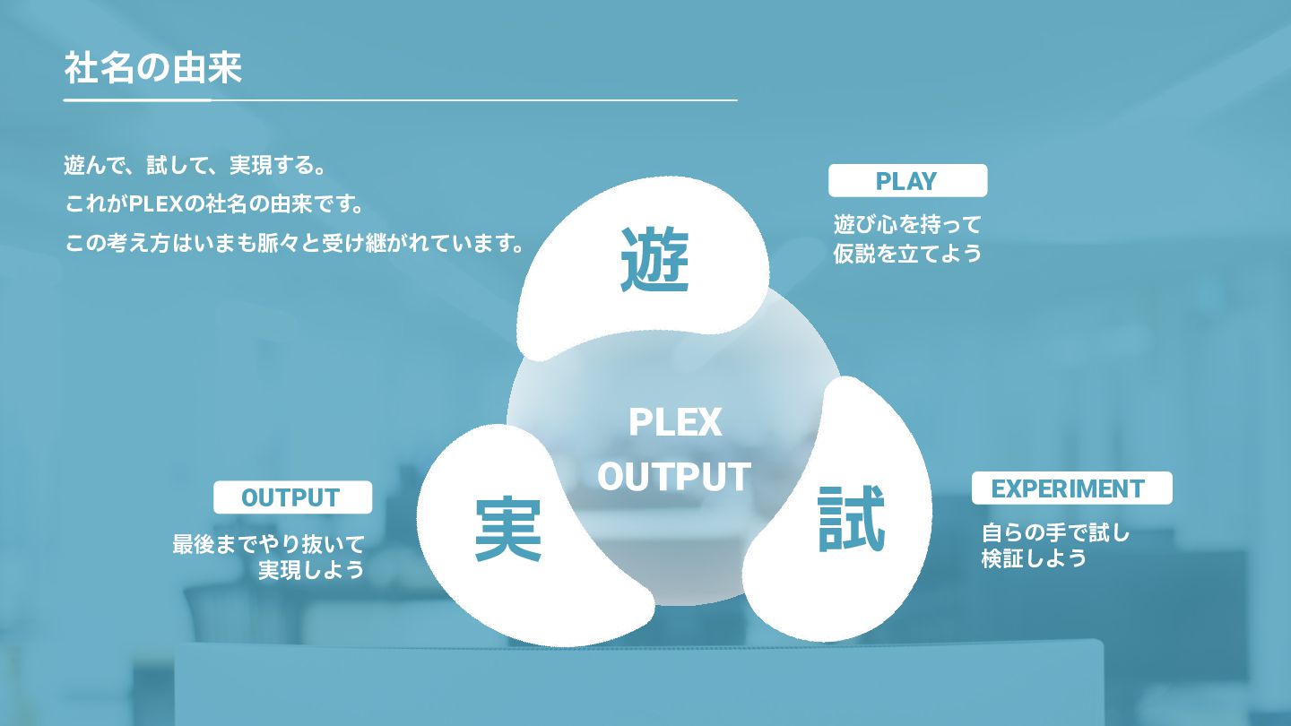 実現しよう 試 遊んで、試して、実現する。 これがPLEXの社名の由来です。 この考え⽅はいまも脈々と受け継がれています。 PLEX OUTPUT 社名の由来