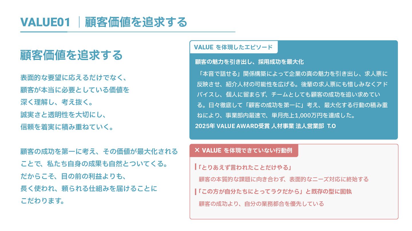 顧客の魅⼒を引き出し、採⽤成功を最⼤化 顧客の本質的な課題に向き合わず、表⾯的なニーズ対応に終始する 「とりあえず⾔われたことだけやる」 「この⽅が⾃分たちにとってラクだから」と既存の型に固執 顧客の成功より、⾃分の業務都合を優先している × VALUE を体現できていない⾏動例 VALUE を体現したエピソード 顧客価値を追求する 「本⾳で話せる」関係構築によって企業の真の魅⼒を引き出し、求⼈票に 反映させ、紹介⼈材の可能性を広げる。後輩の求⼈票にも惜しみなくアド バイスし、個⼈に留まらず、チームとしても顧客の成功を追い求めてい る。⽇々徹底して「顧客の成功を第⼀に」考え、最⼤化する⾏動の積み重 ねにより、事業部内最速で、単⽉売上1,000万円を達成した。 2025年 VALUE AWARD受賞 ⼈材事業 法⼈営業部 T.O VALUE01 |顧客価値を追求する