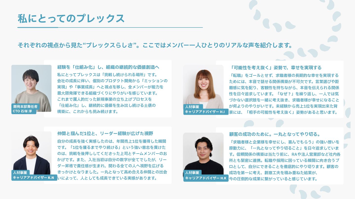 原動⼒に、「⼀丸となってやり切ること」を⽇々追求していま す。信頼関係の構築は当たり前に、RAや法⼈営業部など社内各 所とも緊密に連携。転職や採⽤に困っている瞬間に向き合うプ ロとして、⾃分にできることを徹底的にやり切ります。顧客の 成功を第⼀に考え、創意⼯夫を積み重ねた結果が、 今の圧倒的な成果に繋がっていると感じています。 顧客の成功のために。⼀丸となってやり切る。 私にとってのプレックス ⾃分の成⻑を強く実感したのは、年間売上1位を獲得した瞬間 です。「1位を獲るまでやり続ける」という強い意志を貫けた のは、挑戦を後押ししてくださった上司とチームメンバーのお かげです。また、⼊社当初は⾃分の数字が全てでしたが、リー ダー昇格で責任感が⽣まれ、関わる全ての⼈へ視野を広げる きっかけとなりました。⼀丸となって⾼め合える仲間との出会 いによって、⼈としても成⻑できている実感があります。 仲間と掴んだ1位と、リーダー経験が広げた視野 ⼈材事業 キャリアアドバイザー K.N 開発本部責任 者 私にとってプレックスは「挑戦し続けられる場所」です。 会社の成⻑に伴い、個別のプロダクト開発から「ミッションの 実現」や「事業成⻑」へと視点を移し、全メンバーが能⼒を 最⼤限発揮できる組織づくりにやりがいを感じています。 これまで属⼈的だった新規事業の⽴ち上げプロセスを 「仕組み化」し、継続的に価値を⽣み出し続ける⼟俵の 構築に、これからも挑み続けます。 経験を「仕組み化」し、組織の継続的な価値創造へ CTO ⽯塚 淳 開発本部責任者 ⼈材事業 キャリアアドバイザー H.I ⼈材事業 キャリアアドバイザー H.K