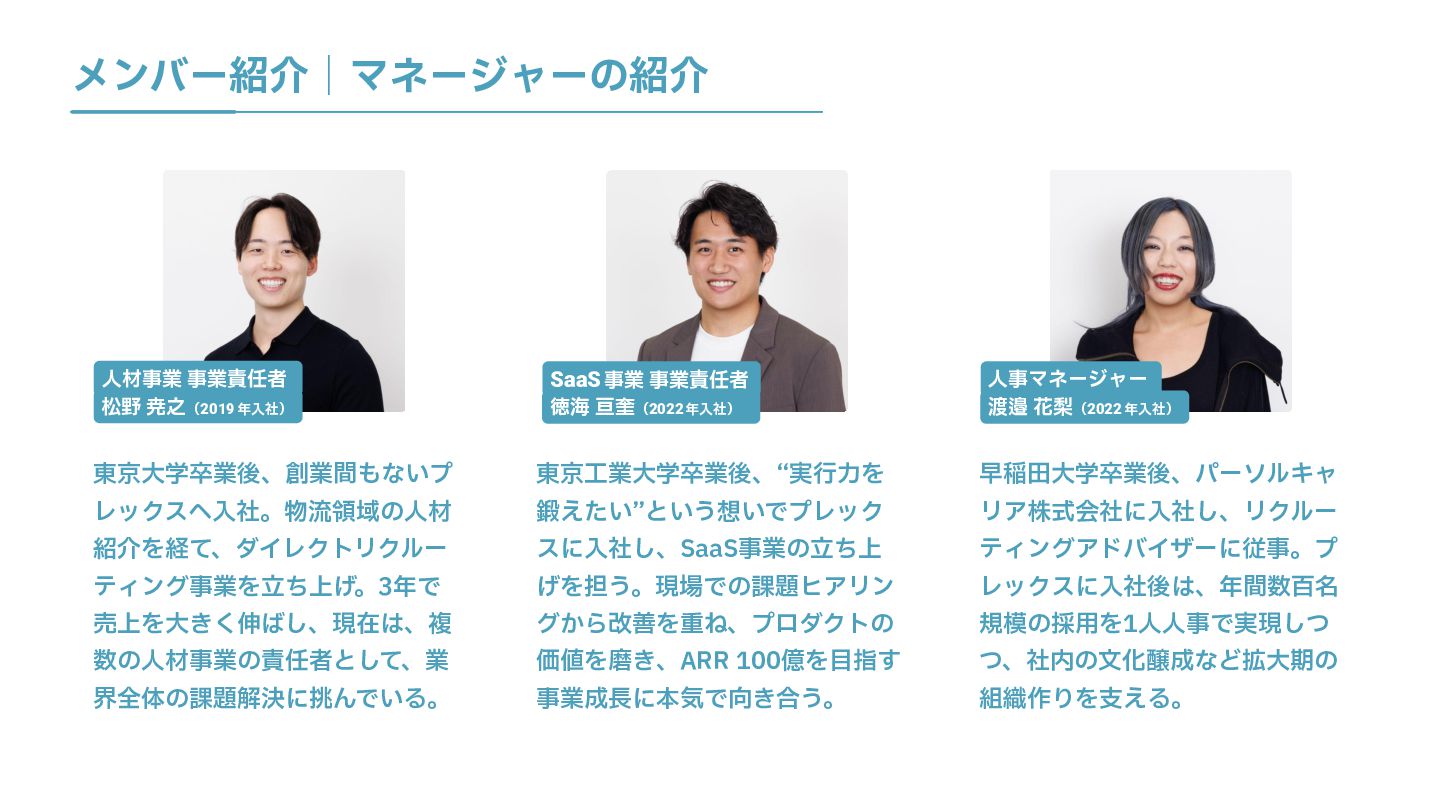 事業責任者 東京⼯業⼤学卒業後、“実⾏⼒を 鍛えたい”という想いでプレック スに⼊社し、SaaS事業の⽴ち上 げを担う。現場での課題ヒアリン グから改善を重ね、プロダクトの 価値を磨き、ARR 100億を⽬指す 事業成⻑に本気で向き合う。 徳海 亘奎(2022年⼊社) SaaS事業 事業責任者 早稲⽥⼤学卒業後、パーソルキャ リア株式会社に⼊社し、リクルー ティングアドバイザーに従事。プ レックスに⼊社後は、年間数百名 規模の採⽤を1⼈⼈事で実現しつ つ、社内の⽂化醸成など拡⼤期の 組織作りを⽀える。 渡邉 花梨(2022年⼊社) ⼈事マネージャー メンバー紹介|マネージャーの紹介