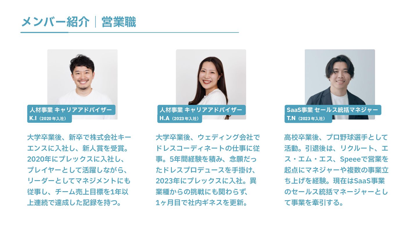 ⼤学卒業後、ウェディング会社で ドレスコーディネートの仕事に従 事。5年間経験を積み、念願だっ たドレスプロデュースを⼿掛け、 2023年にプレックスに⼊社。異 業種からの挑戦にも関わらず、 1ヶ⽉⽬で社内ギネスを更新。 H.A(2023年⼊社) ⼈材事業 キャリアアドバイザー ⾼校卒業後、プロ野球選⼿として 活動。引退後は、リクルート、エ ス・エム・エス、Speeeで営業を 起点にマネジャーや複数の事業⽴ ち上げを経験。現在はSaaS事業 のセールス統括マネージャーとし て事業を牽引する。 T.N(2023年⼊社) SaaS事業 セールス統括マネジャー メンバー紹介|営業職
