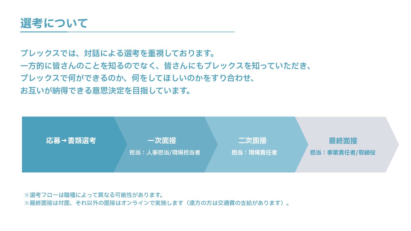 ・フルスタックエンジニア ・テックリード エンジニア職 ・デジタルマーケティング ・事業企画・事業推進 ・経営企画 ・新規事業開発 企画職 ・新卒採⽤担当 ・中途採⽤担当 ・総務・法務 ・営業アシスタント バックオフィス 採⽤情報 https://plex.co.jp/recruit その他ポジション紹介 ※その他オープンポジションでの採⽤も実施しています。  詳細は採⽤情報からご確認ください。
