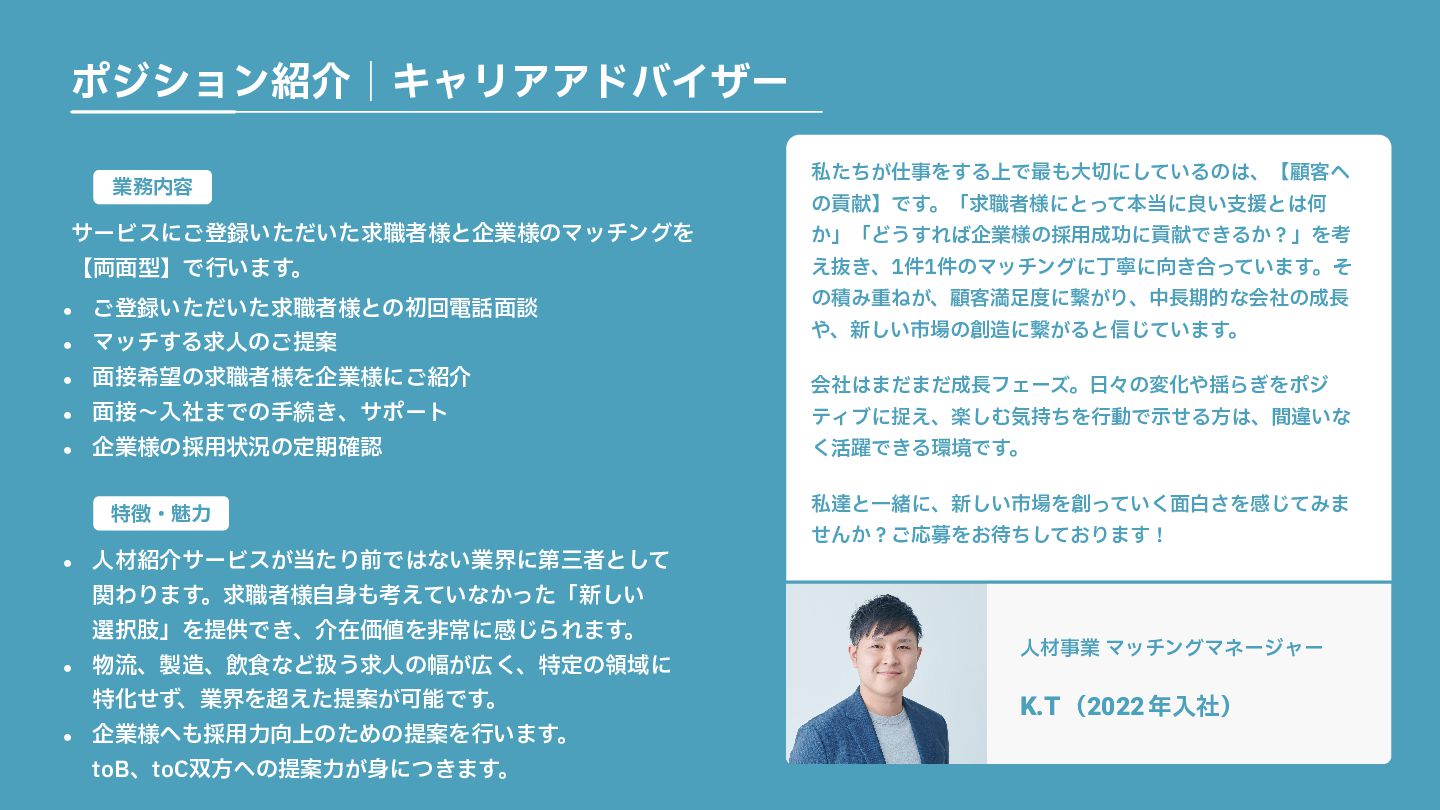 • 企業様の採⽤状況の定期確認 特徴・魅⼒ • ⼈材紹介サービスが当たり前ではない業界に第三者として 関わります。求職者様⾃⾝も考えていなかった「新しい 選択肢」を提供でき、介在価値を⾮常に感じられます。 • 物流、製造、飲⾷など扱う求⼈の幅が広く、特定の領域に 特化せず、業界を超えた提案が可能です。 • 企業様へも採⽤⼒向上のための提案を⾏います。 toB、toC双⽅への提案⼒が⾝につきます。 業務内容 私たちが仕事をする上で最も⼤切にしているのは、【顧客へ の貢献】です。「求職者様にとって本当に良い⽀援とは何 か」「どうすれば企業様の採⽤成功に貢献できるか?」を考 え抜き、1件1件のマッチングに丁寧に向き合っています。そ の積み重ねが、顧客満⾜度に繋がり、中⻑期的な会社の成⻑ や、新しい市場の創造に繋がると信じています。 会社はまだまだ成⻑フェーズ。⽇々の変化や揺らぎをポジ ティブに捉え、楽しむ気持ちを⾏動で⽰せる⽅は、間違いな く活躍できる環境です。 私達と⼀緒に、新しい市場を創っていく⾯⽩さを感じてみま せんか?ご応募をお待ちしております! ⼈材事業 マッチングマネージャー K.T(2022年⼊社) ポジション紹介|キャリアアドバイザー