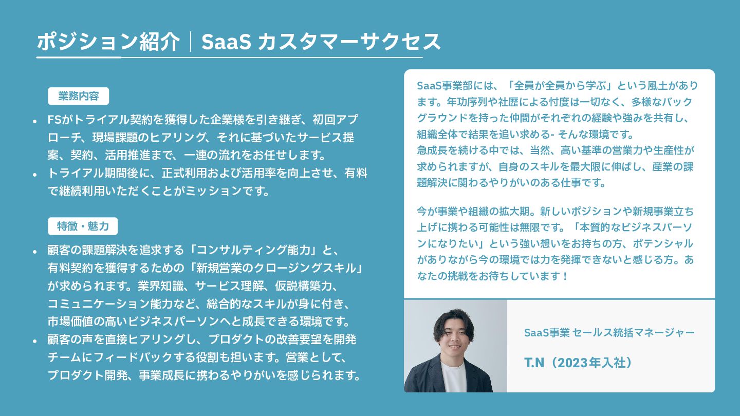 有料契約を獲得するための「新規営業のクロージングスキル」 が求められます。業界知識、サービス理解、仮説構築⼒、 コミュニケーション能⼒など、総合的なスキルが⾝に付き、 市場価値の⾼いビジネスパーソンへと成⻑できる環境です。 • 顧客の声を直接ヒアリングし、プロダクトの改善要望を開発 チームにフィードバックする役割も担います。営業として、 プロダクト開発、事業成⻑に携わるやりがいを感じられます。 業務内容 SaaS事業部には、「全員が全員から学ぶ」という⾵⼟があり ます。年功序列や社歴による忖度は⼀切なく、多様なバック グラウンドを持った仲間がそれぞれの経験や強みを共有し、 組織全体で結果を追い求める- そんな環境です。 急成⻑を続ける中では、当然、⾼い基準の営業⼒や⽣産性が 求められますが、⾃⾝のスキルを最⼤限に伸ばし、産業の課 題解決に関わるやりがいのある仕事です。 今が事業や組織の拡⼤期。新しいポジションや新規事業⽴ち 上げに携わる可能性は無限です。「本質的なビジネスパーソ ンになりたい」という強い想いをお持ちの⽅、ポテンシャル がありながら今の環境では⼒を発揮できないと感じる⽅。あ なたの挑戦をお待ちしています! SaaS事業 セールス統括マネージャー T.N(2023年⼊社) ポジション紹介|SaaS カスタマーサクセス