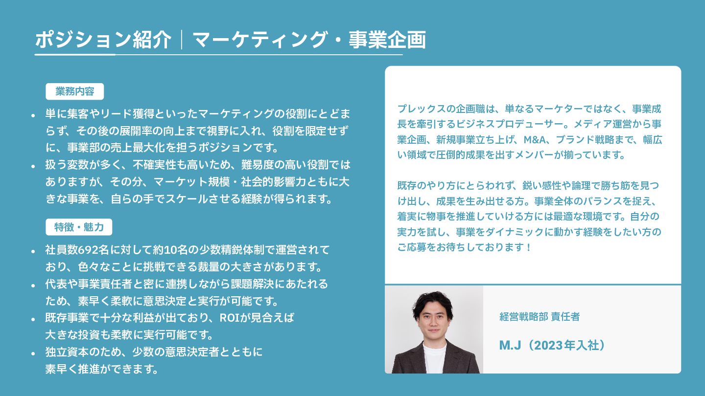 社員数692名に対して約10名の少数精鋭体制で運営されて おり、⾊々なことに挑戦できる裁量の⼤きさがあります。 • 代表や事業責任者と密に連携しながら課題解決にあたれる ため、素早く柔軟に意思決定と実⾏が可能です。 • 既存事業で⼗分な利益が出ており、ROIが⾒合えば ⼤きな投資も柔軟に実⾏可能です。 • 独⽴資本のため、少数の意思決定者とともに 素早く推進ができます。 業務内容 プレックスの企画職は、単なるマーケターではなく、事業成 ⻑を牽引するビジネスプロデューサー。メディア運営から事 業企画、新規事業⽴ち上げ、M&A、ブランド戦略まで、幅広 い領域で圧倒的成果を出すメンバーが揃っています。 既存のやり⽅にとらわれず、鋭い感性や論理で勝ち筋を⾒つ け出し、成果を⽣み出せる⽅。事業全体のバランスを捉え、 着実に物事を推進していける⽅には最適な環境です。⾃分の 実⼒を試し、事業をダイナミックに動かす経験をしたい⽅の ご応募をお待ちしております! 経営戦略部 責任者 M.J(2023年⼊社) ポジション紹介|マーケティング・事業企画