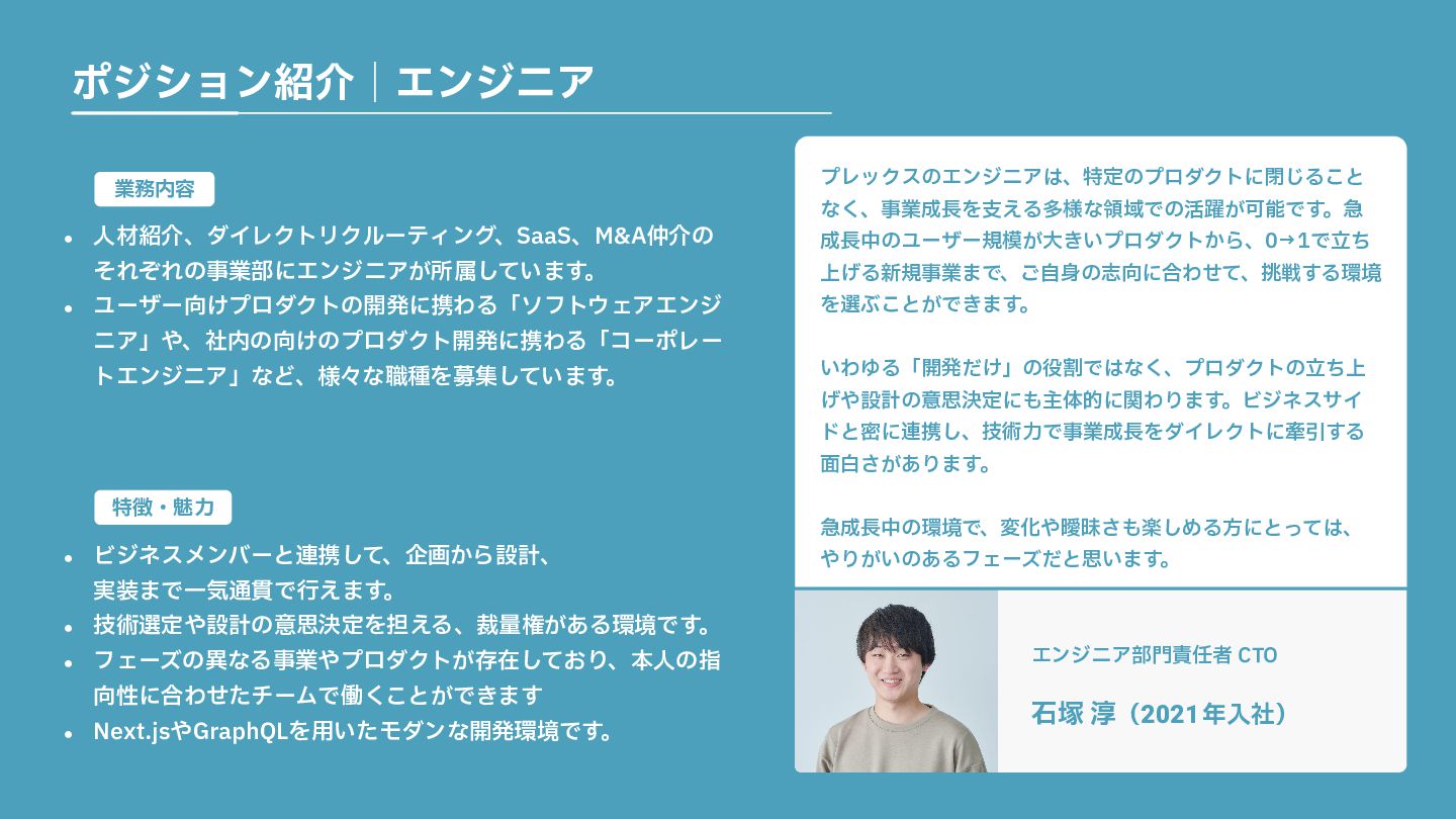 実装まで⼀気通貫で⾏えます。 • 技術選定や設計の意思決定を担える、裁量権がある環境です。 • フェーズの異なる事業やプロダクトが存在しており、本⼈の指 向性に合わせたチームで働くことができます • Next.jsやGraphQLを⽤いたモダンな開発環境です。 業務内容 エンジニア部⾨責任者 CTO ⽯塚 淳(2021年⼊社) プレックスのエンジニアは、特定のプロダクトに閉じること なく、事業成⻑を⽀える多様な領域での活躍が可能です。急 成⻑中のユーザー規模が⼤きいプロダクトから、0→1で⽴ち 上げる新規事業まで、ご⾃⾝の志向に合わせて、挑戦する環境 を選ぶことができます。 いわゆる「開発だけ」の役割ではなく、プロダクトの⽴ち上 げや設計の意思決定にも主体的に関わります。ビジネスサイ ドと密に連携し、技術⼒で事業成⻑をダイレクトに牽引する ⾯⽩さがあります。 急成⻑中の環境で、変化や曖昧さも楽しめる⽅にとっては、 やりがいのあるフェーズだと思います。 ポジション紹介|エンジニア