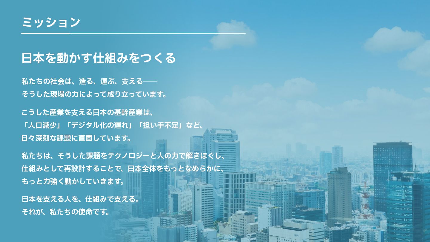 ・後継者不⾜による倒産 ・倒産による経営資源の霧散 プレックスが⽬指す末来 持続可能な インフラの実現 ⽣産性の⾼い 事業運営の実現 次世代への 事業承継の実現 技術の進歩 価値のある仕組みづくり 業界の変化 ⼈⼝動態の変化 クラウド 働き⽅の変化 画像認識 の精度向上 ⽣成AI 規制緩和 「基幹産業」の根本的な課題を解決し、 持続可能な社会を実現する プレックスが挑む課題