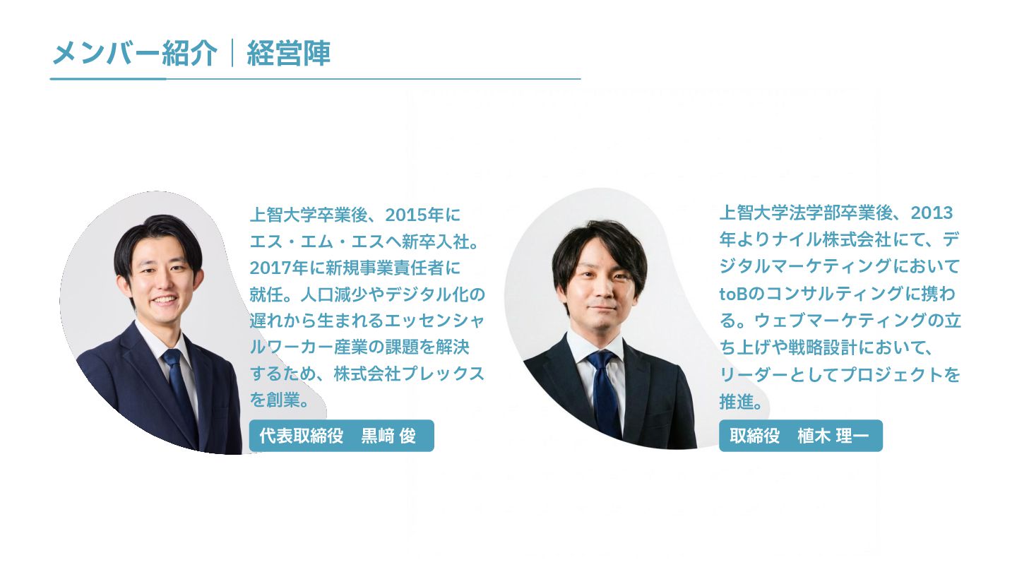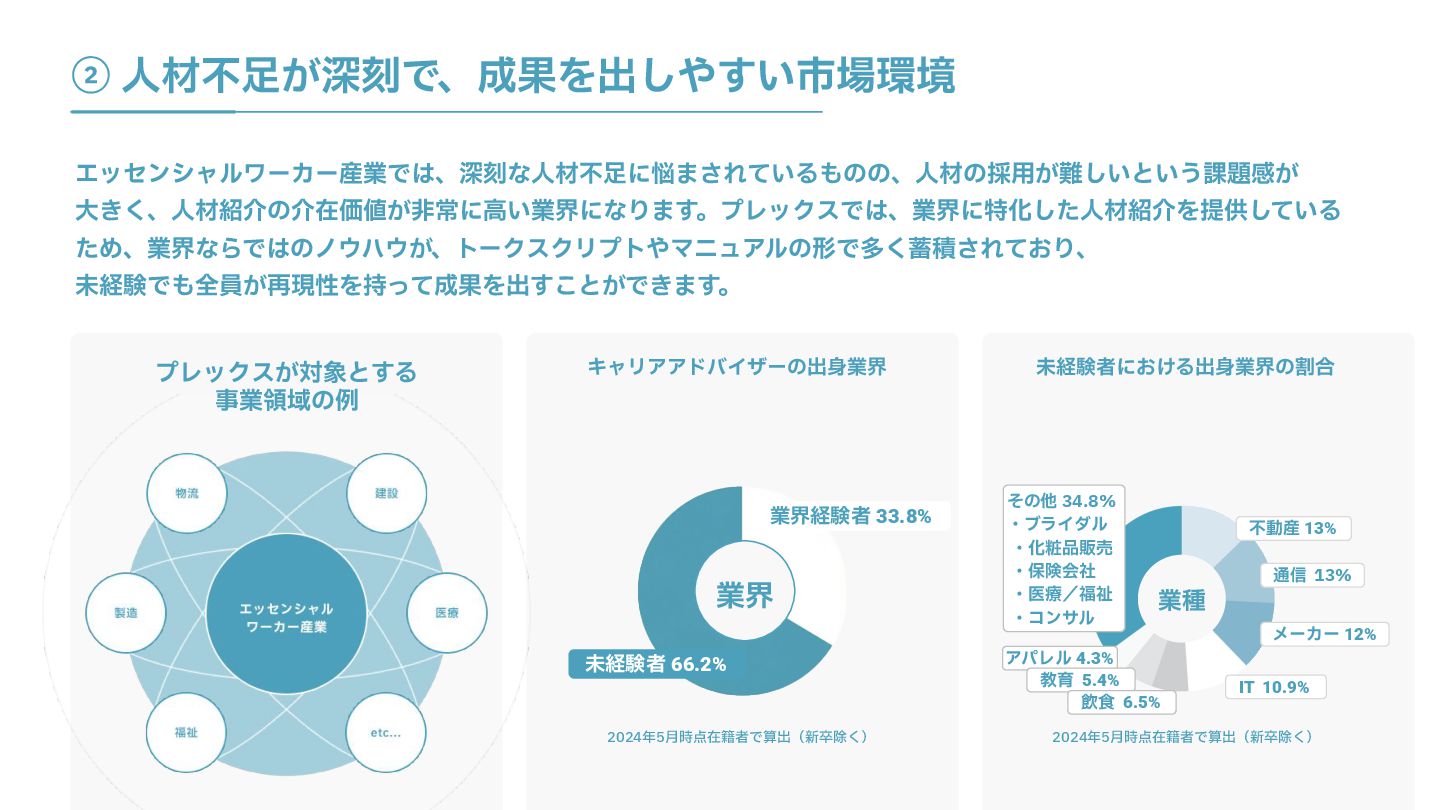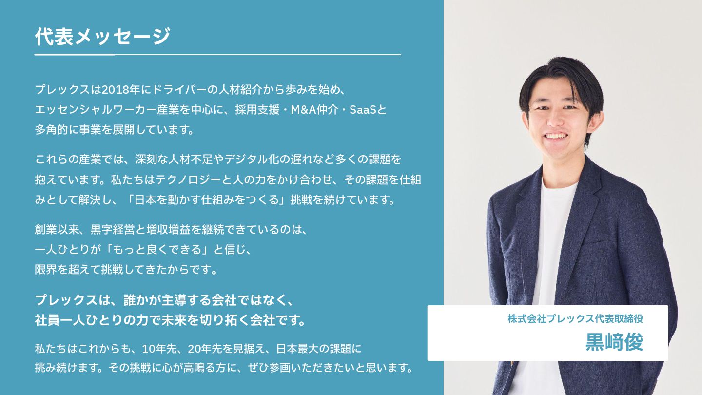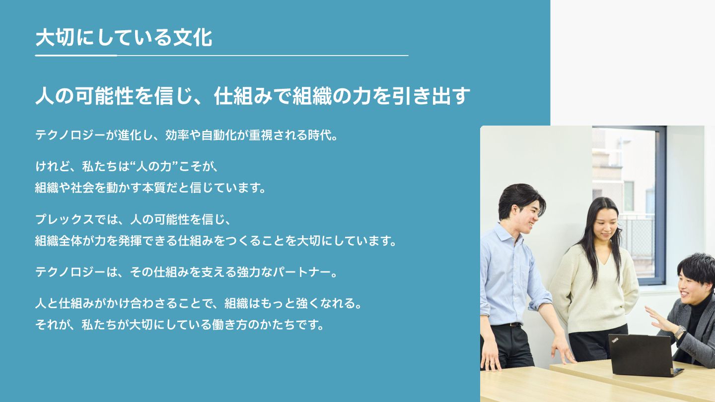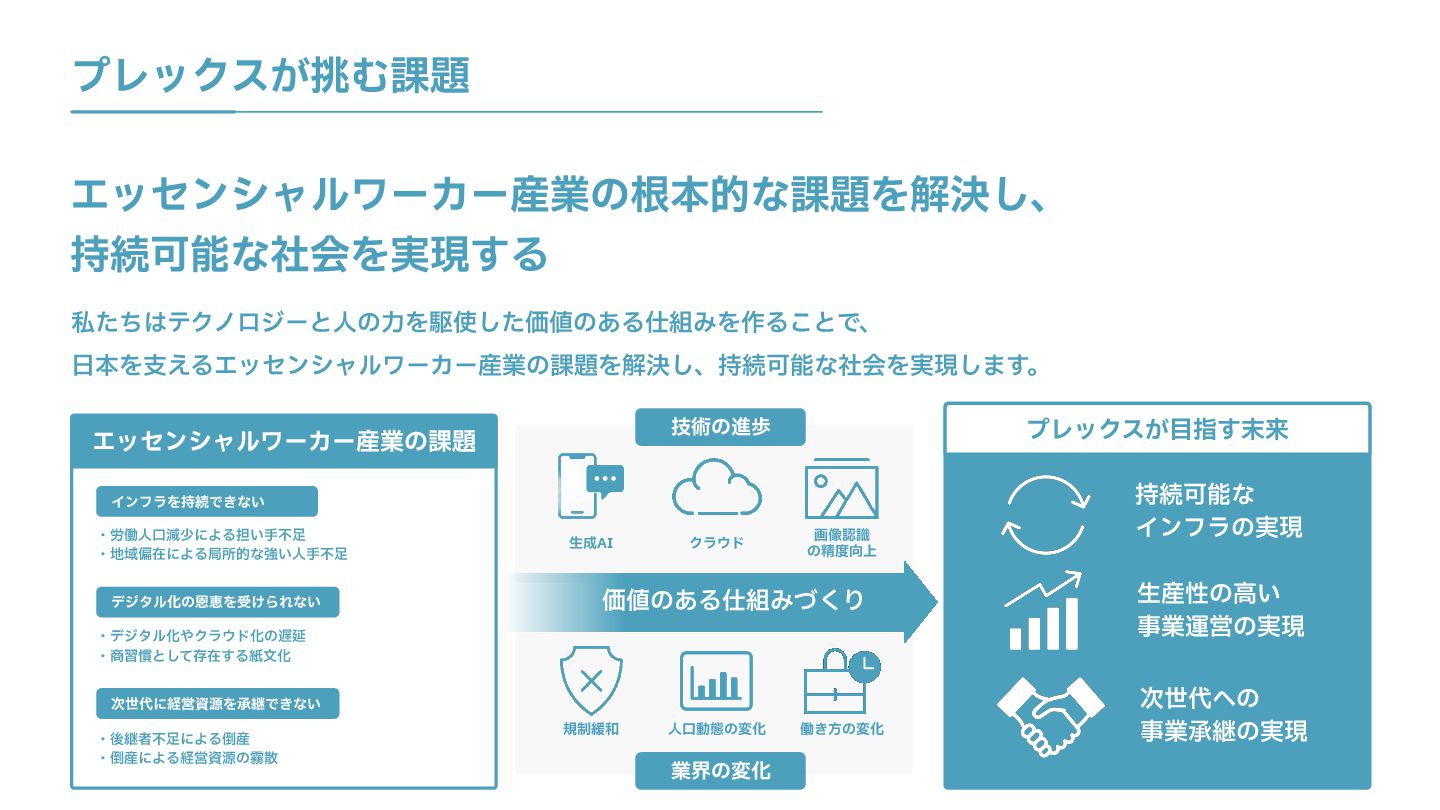 株式会社プレックスは、「日本を動かす仕組みをつくる」をミッションに、エッセンシャルワーカー産業の課題解決をはじめとして、人と企業の可能性を最大限に引き出す事業を展開する企業です。