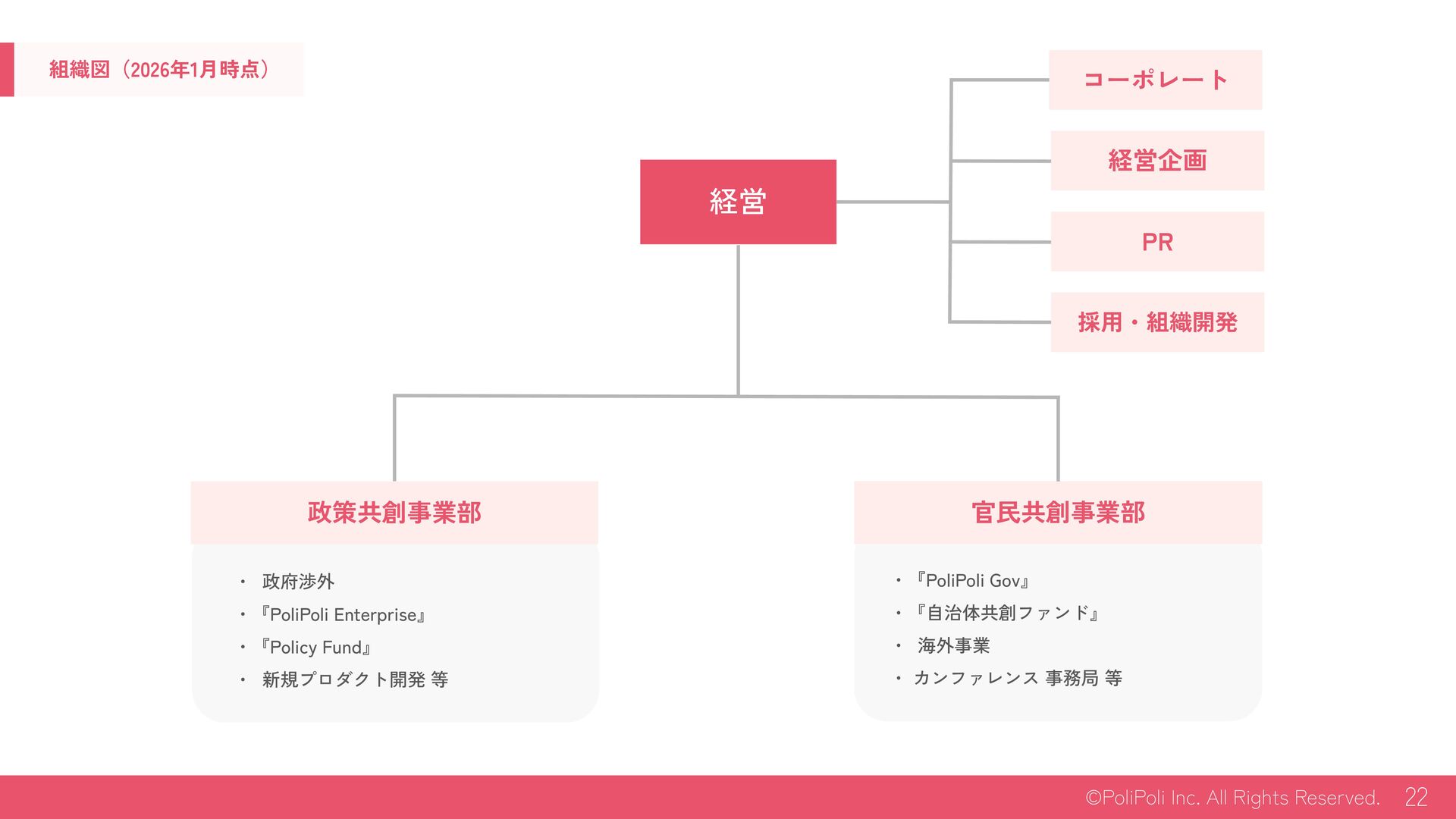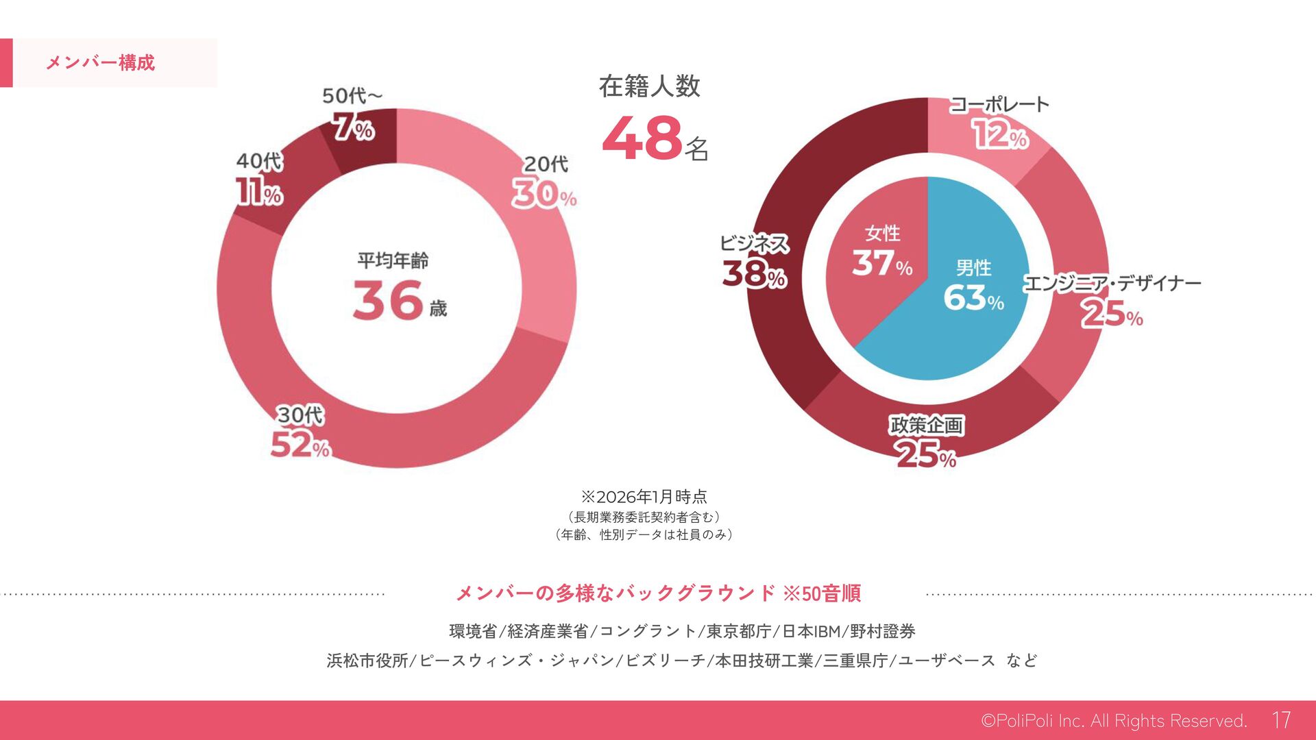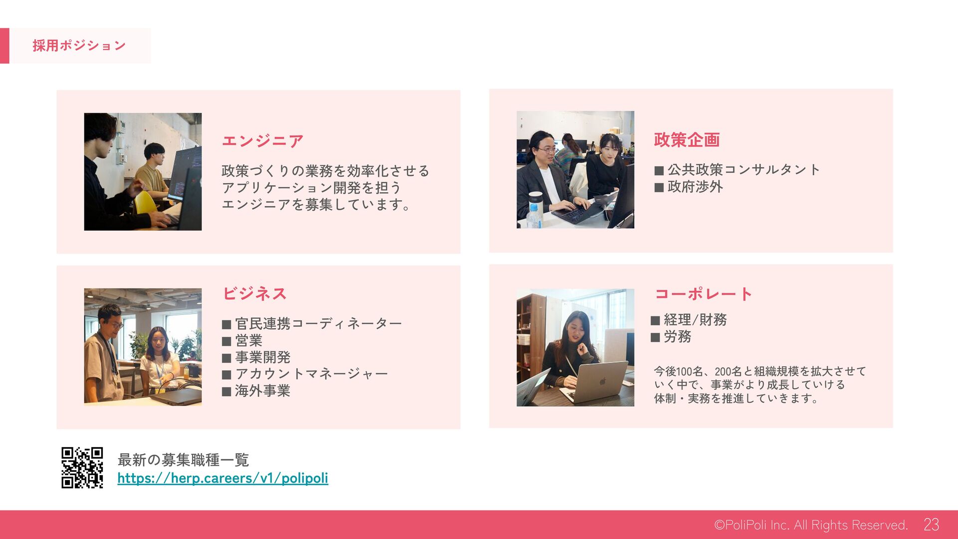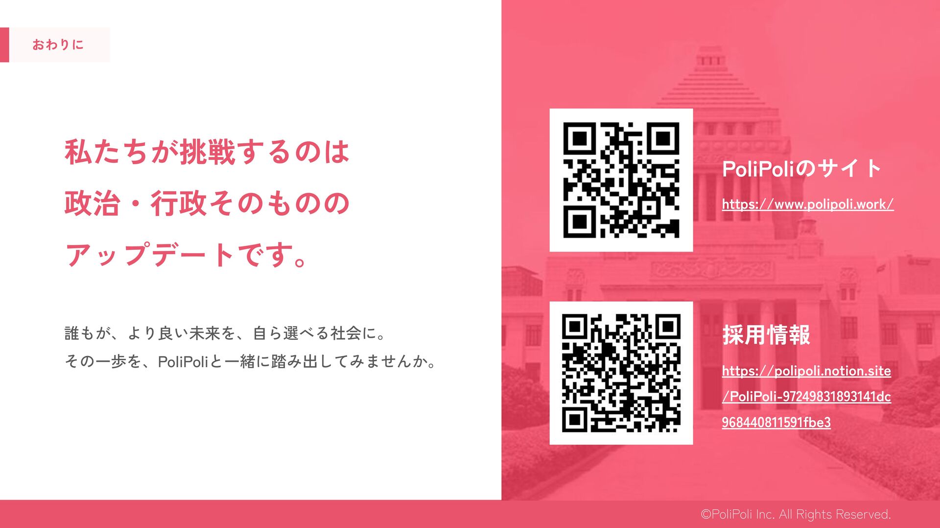 光 PR 大手自動車メーカーでPR、エンターテイメント業 界団体でルールメイキング、政策提言に携わる。 #業界団体 横戸 健介 PoliPoli Enterprise 浜松市役所でデジタル活用や官民共創による持続可能 なまちづくりに向け、戦略策定、政策実装を牽引。 #自治体 瀧本 陽一 官民共創事業部 東京都庁産業振興部局などで政策実装。スタート アップへ転じ、渉外・カスタマーサクセスを経験。 #自治体 #スタートアップ 田川 耕治 官民共創事業部 独学でプログラミングを学び、新規プロダクトの 立ち上げなどを経験。 #エンジニア 高野 裕樹 エンジニア 経済産業省でデジタル政策、地方人材政策を担当。 ビズリーチでSaaSビジネスの事業企画を経験。 #省庁 #メガベンチャー 小倉 政貴 PoliPoli Enterprise 国際人権NGO、日本有数の子ども関連NPOで政府 や自治体への政策提言に携わる。 #NPO 幡谷 拓弥 Policy Fund ユーザベースで「NewsPicks」広告事業部を立ち 上げ、ブランディング・マーケティングを推進。 #メディア #スタートアップ 西村 脩平 PoliPoli Enterprise メンバーによる発信はこちら 秋 圭史 政府渉外 https://note.com/polipoli_info 大学4年時にインターンとしてPoliPoliに参画。政治学 を専攻し、現在、大学院博士課程にも在学中。 #スタートアップ #新卒 16 メンバー (一部)
