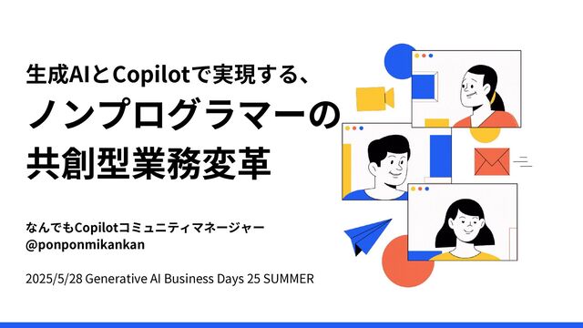 生成AIとCopilotで実現する、 ノンプログラマーの 共創型業務変革 なんでもCopilotコミュニティマネージャー @ponponmikankan 2025/5/28 Generative AI Business Days