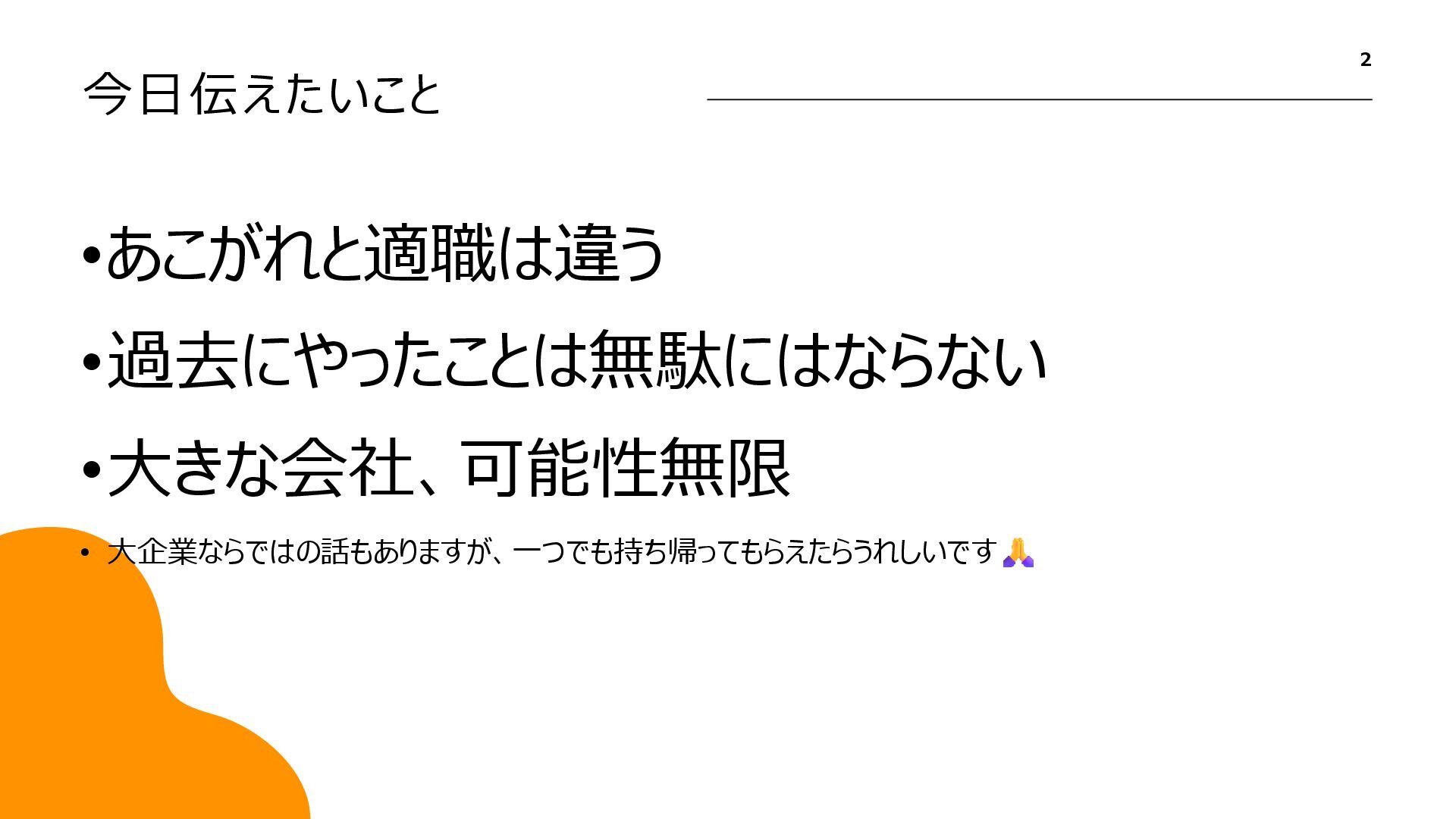 今日伝えたいこと 2 •あこがれと適職は違う •過去にやったことは無駄にはならない •大きな会社、可能性無限 • 大企業ならではの話もありますが、一つでも持ち帰ってもらえたらうれしいです