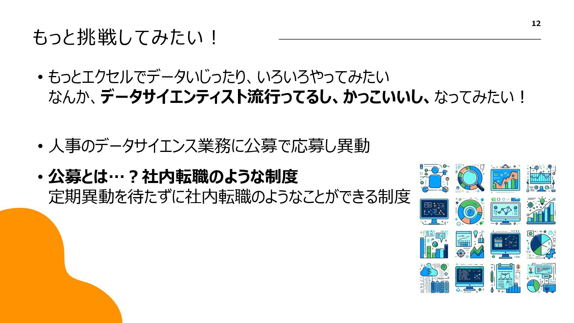 もっと挑戦してみたい! 12 • もっとエクセルでデータいじったり、いろいろやってみたい なんか、データサイエンティスト流行ってるし、かっこいいし、なってみたい! • 人事のデータサイエンス業務に公募で応募し異動 • 公募とは…?社内転職のような制度 定期異動を待たずに社内転職のようなことができる制度