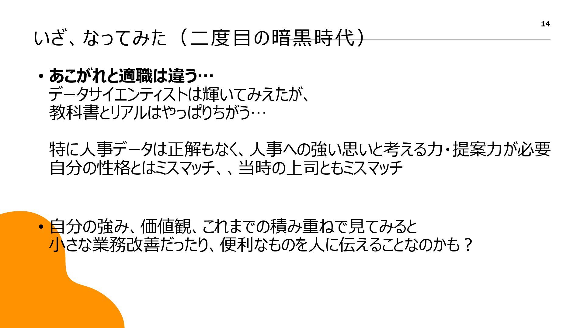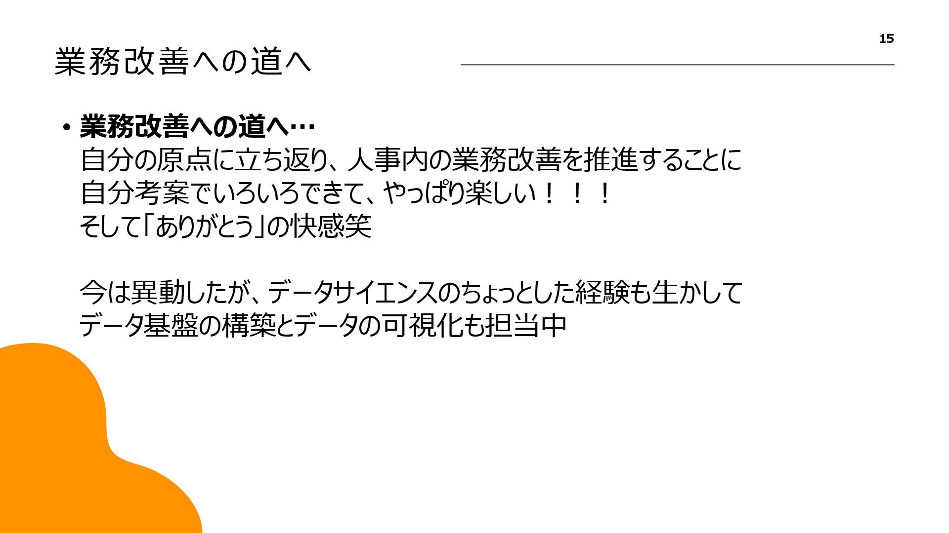 いざ、なってみた(二度目の暗黒時代) 14 • あこがれと適職は違う… データサイエンティストは輝いてみえたが、 教科書とリアルはやっぱりちがう… 特に人事データは正解もなく、人事への強い思いと考える力・提案力が必要 自分の性格とはミスマッチ、、当時の上司ともミスマッチ • 自分の強み、価値観、これまでの積み重ねで見てみると