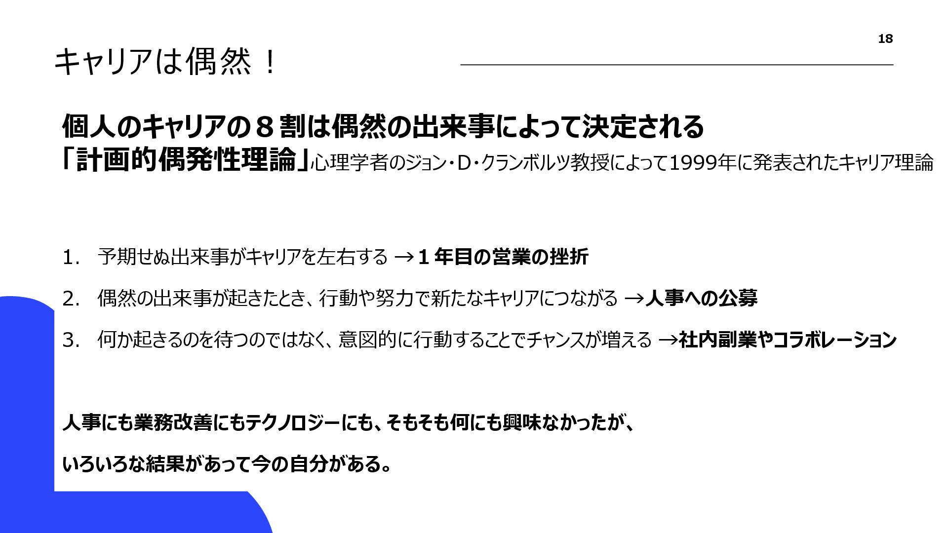 3. 何か起きるのを待つのではなく、意図的に行動することでチャンスが増える →社内副業やコラボレーション 人事にも業務改善にもテクノロジーにも、そもそも何にも興味なかったが、 いろいろな結果があって今の自分がある。