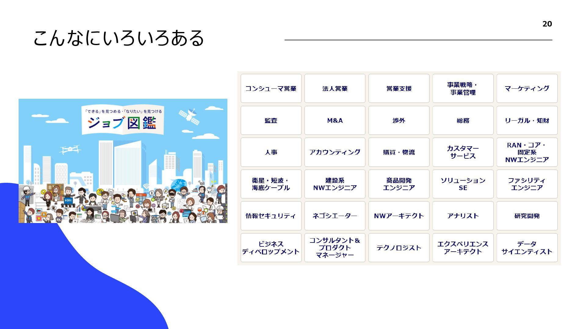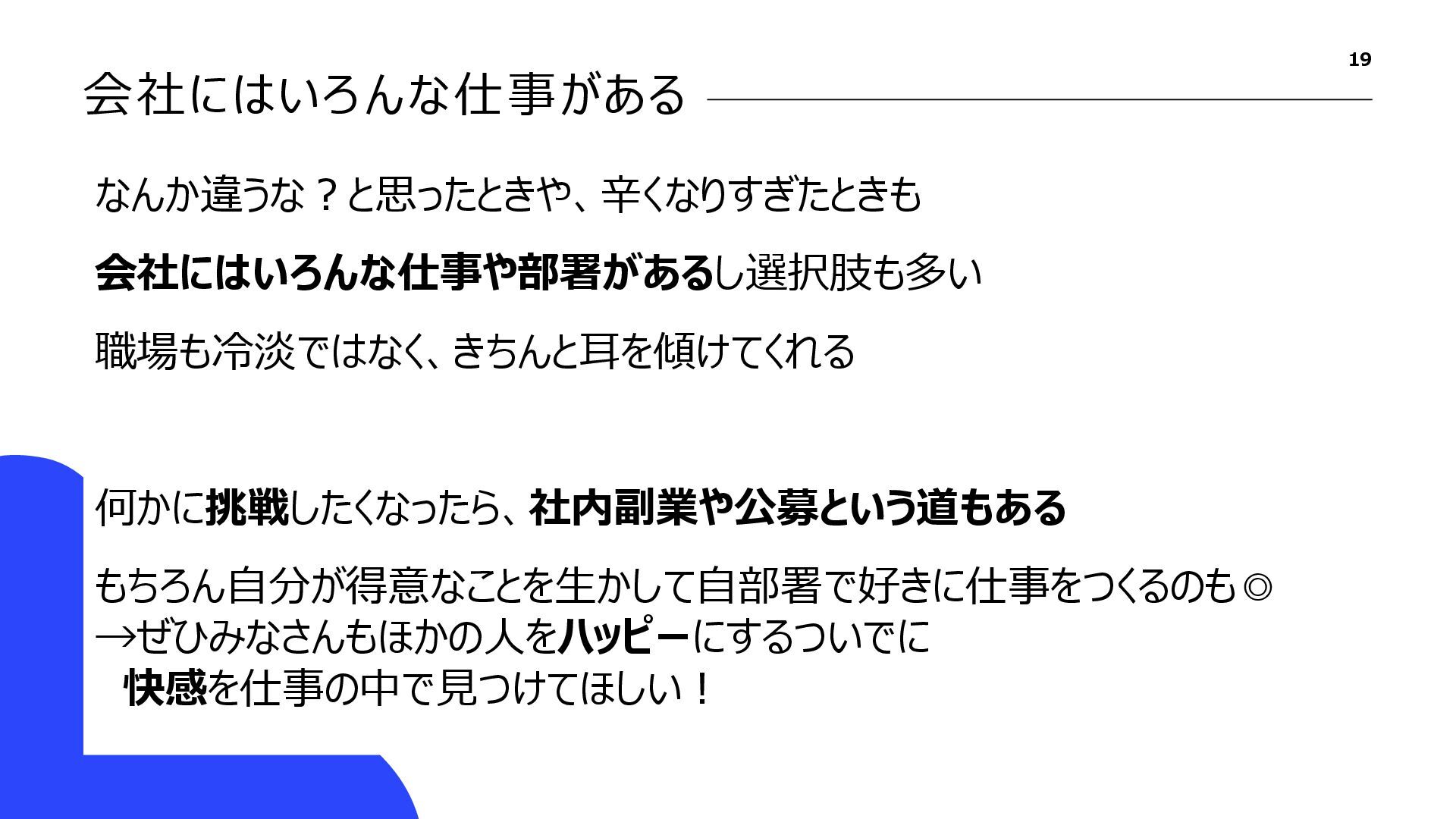 19 会社にはいろんな仕事がある なんか違うな?と思ったときや、辛くなりすぎたときも 会社にはいろんな仕事や部署があるし選択肢も多い 職場も冷淡ではなく、きちんと耳を傾けてくれる 何かに挑戦したくなったら、社内副業や公募という道もある もちろん自分が得意なことを生かして自部署で好きに仕事をつくるのも◎ →ぜひみなさんもほかの人をハッピーにするついでに 快感を仕事の中で見つけてほしい!