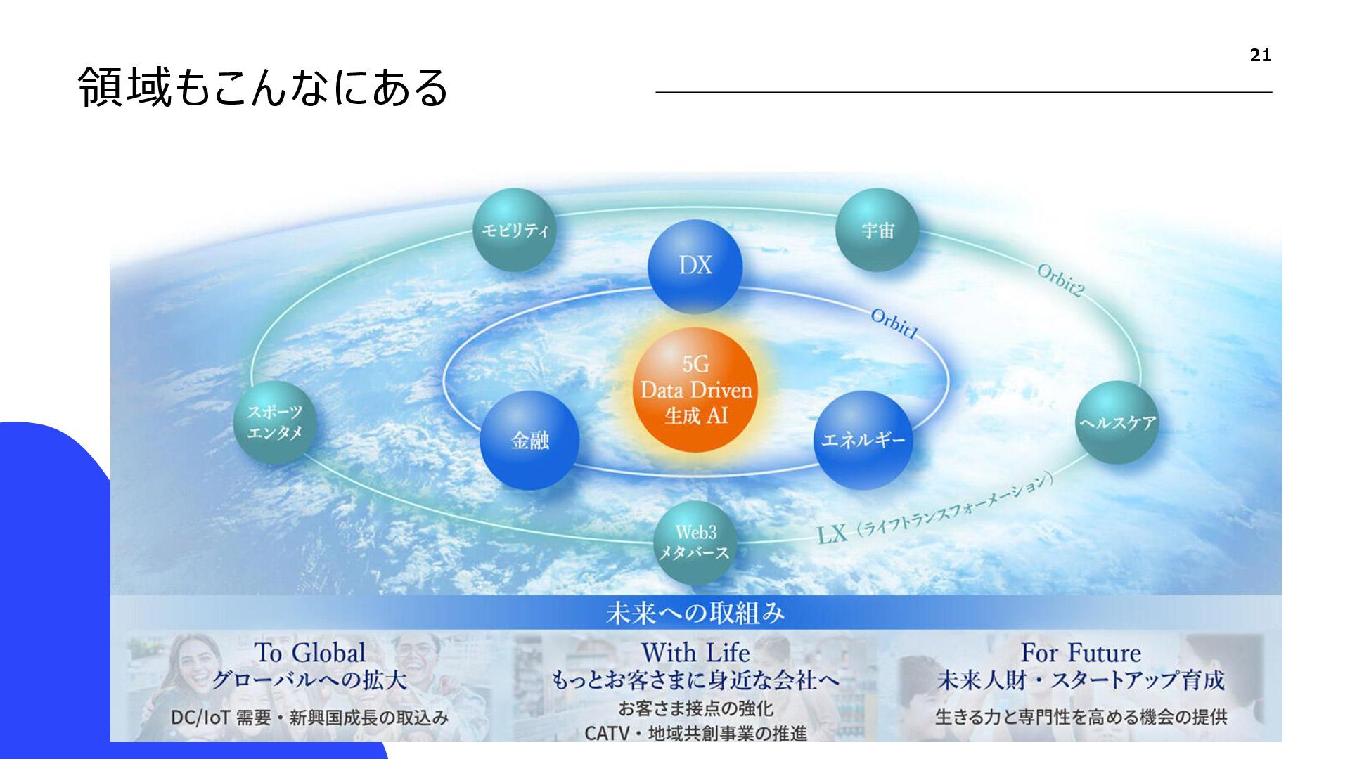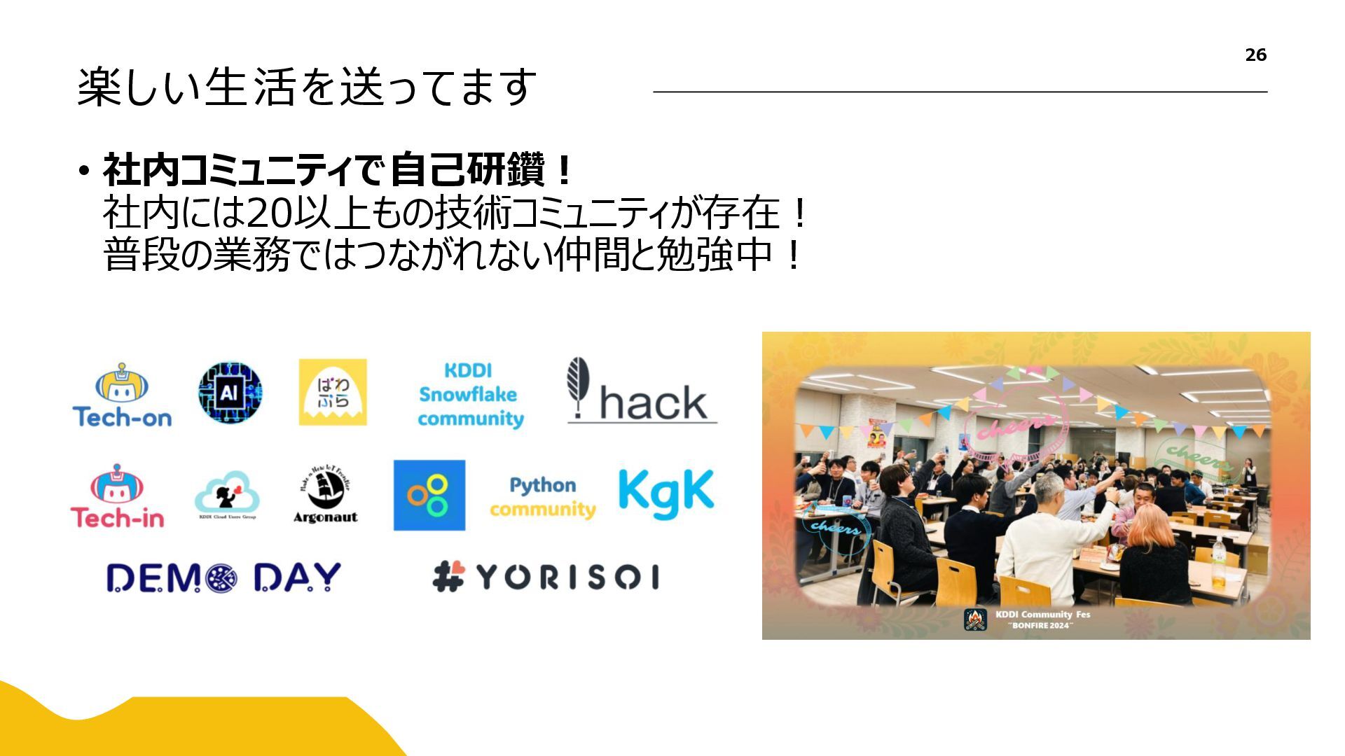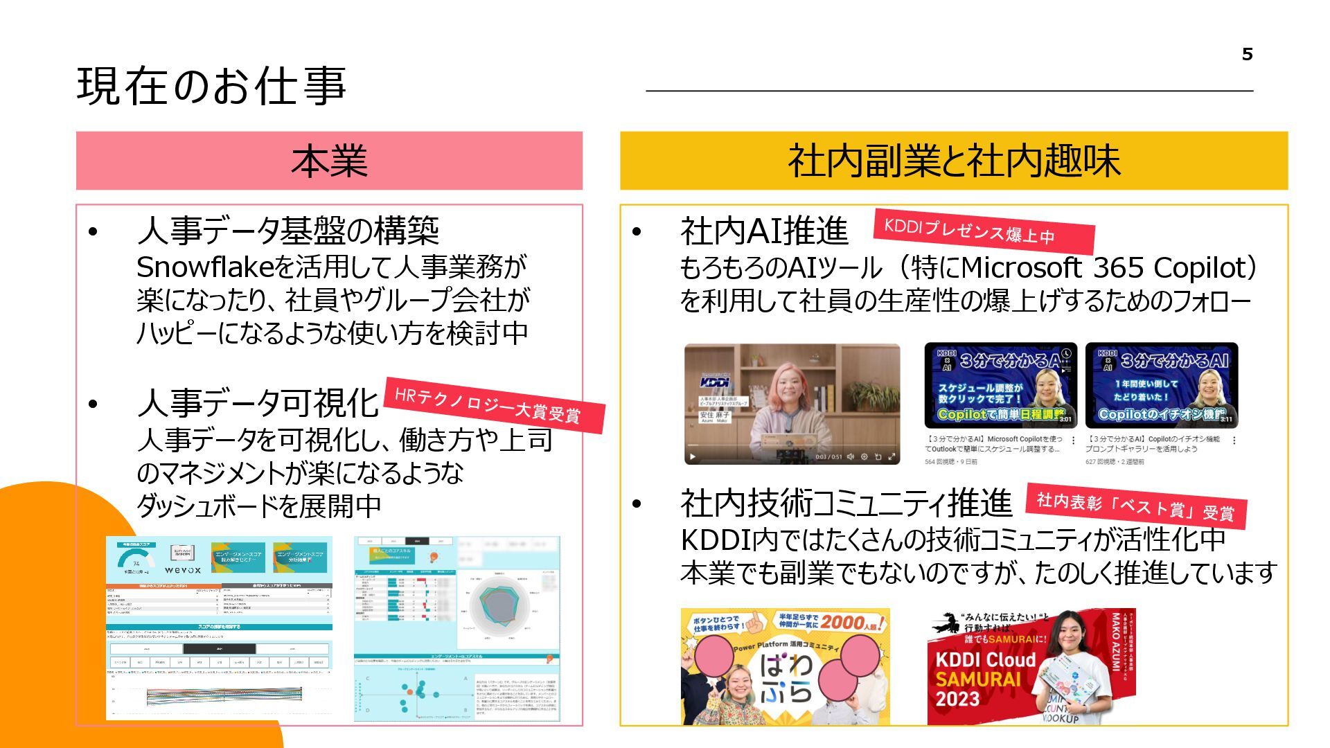 人事データ可視化 人事データを可視化し、働き方や上司 のマネジメントが楽になるような ダッシュボードを展開中 • 社内AI推進 もろもろのAIツール(特にMicrosoft 365 Copilot) を利用して社員の生産性の爆上げするためのフォロー • 社内技術コミュニティ推進 KDDI内ではたくさんの技術コミュニティが活性化中 本業でも副業でもないのですが、たのしく推進しています