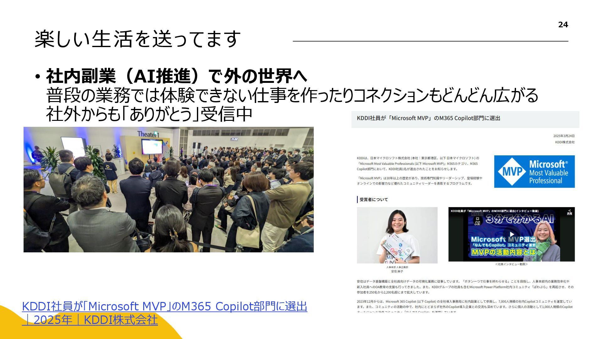 楽しい生活を送ってます 24 • 社内副業(AI推進)で外の世界へ 普段の業務では体験できない仕事を作ったりコネクションもどんどん広がる 社外からも「ありがとう」受信中 KDDI社員が「Microsoft MVP」のM365 Copilot部門に選出 |2025年|KDDI株式会社