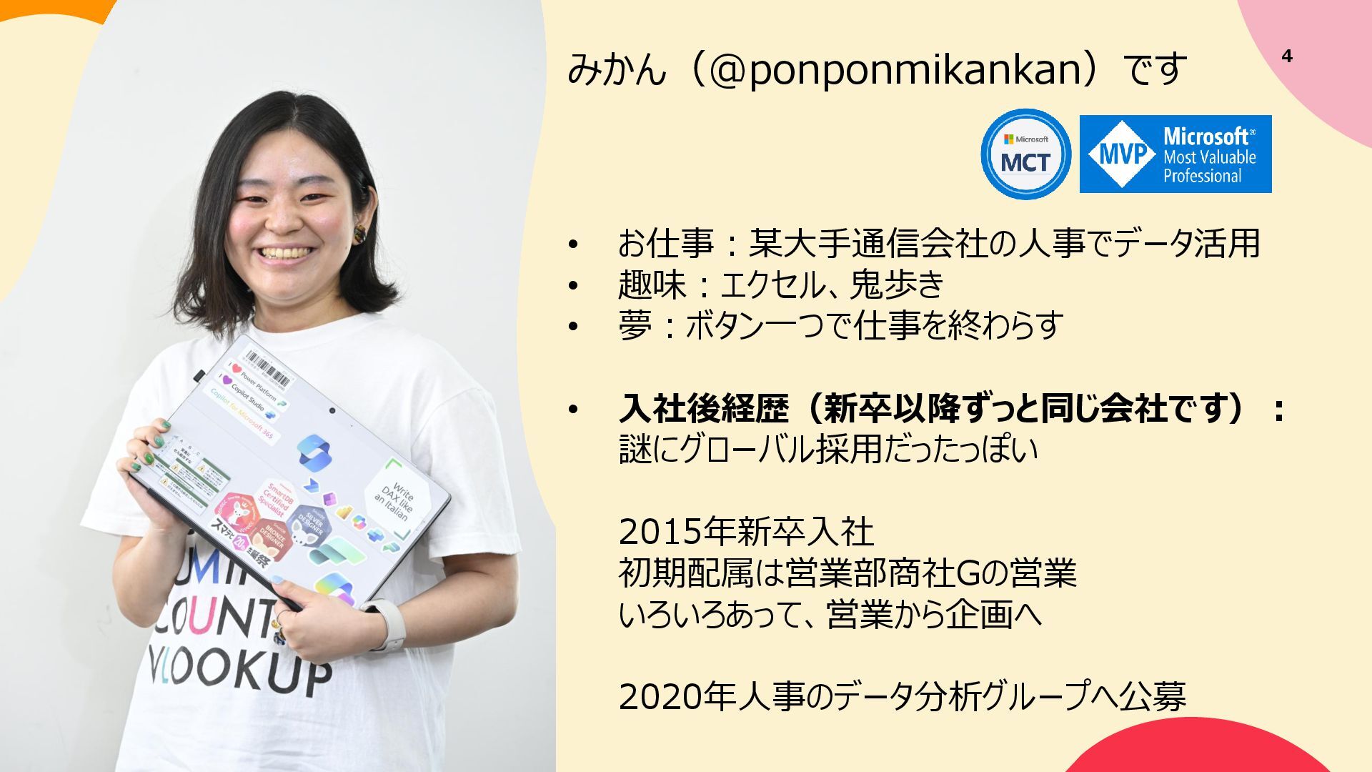 4 みかん(@ponponmikankan)です • お仕事:某大手通信会社の人事でデータ活用 • 趣味:エクセル、鬼歩き • 夢:ボタン一つで仕事を終わらす • 入社後経歴(新卒以降ずっと同じ会社です):