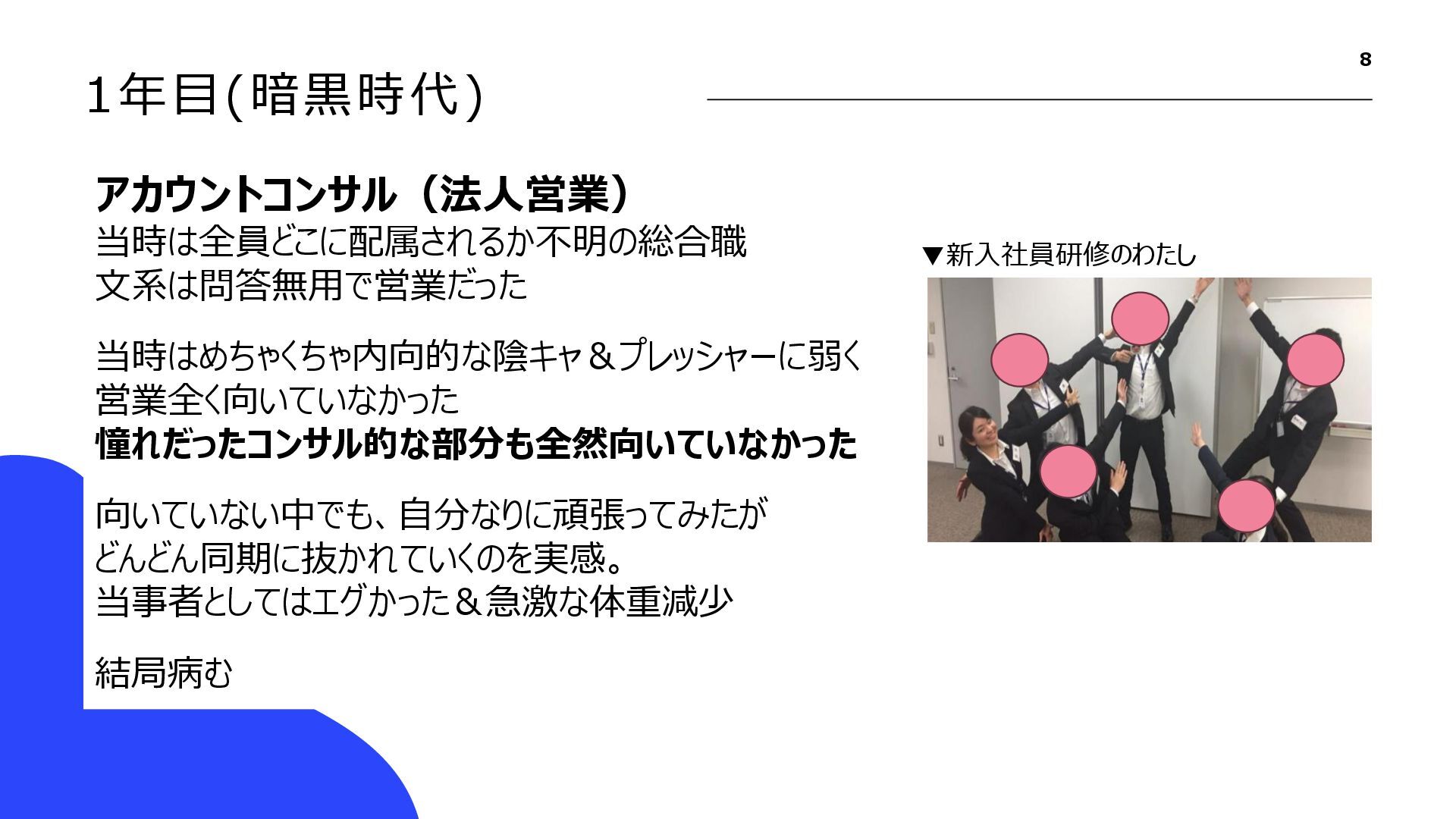 1年目(暗黒時代) 8 アカウントコンサル(法人営業) 当時は全員どこに配属されるか不明の総合職 文系は問答無用で営業だった 当時はめちゃくちゃ内向的な陰キャ&プレッシャーに弱く 営業全く向いていなかった 憧れだったコンサル的な部分も全然向いていなかった 向いていない中でも、自分なりに頑張ってみたが どんどん同期に抜かれていくのを実感。