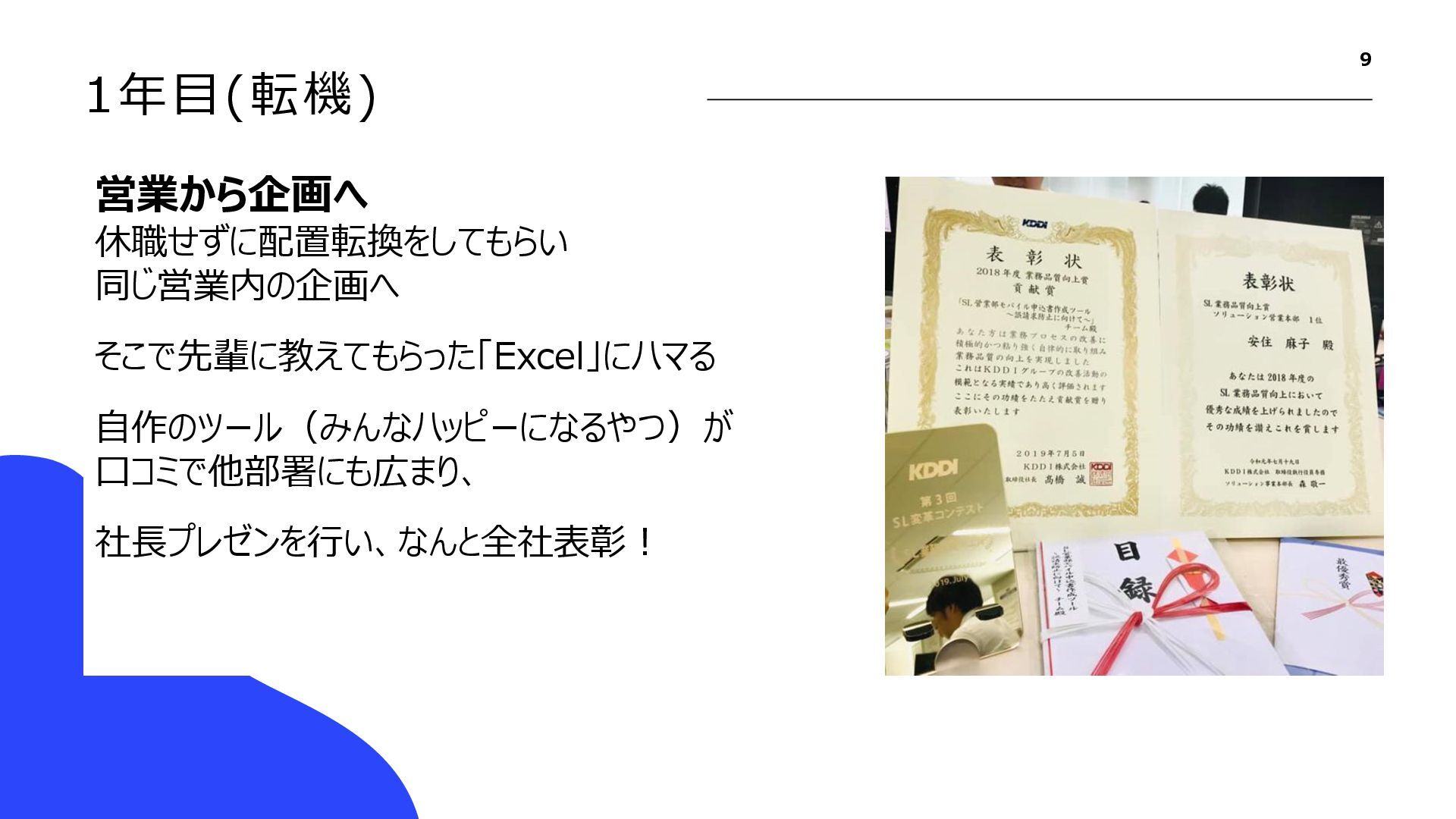 9 1年目(転機) 営業から企画へ 休職せずに配置転換をしてもらい 同じ営業内の企画へ そこで先輩に教えてもらった「Excel」にハマる 自作のツール(みんなハッピーになるやつ)が 口コミで他部署にも広まり、 社長プレゼンを行い、なんと全社表彰!