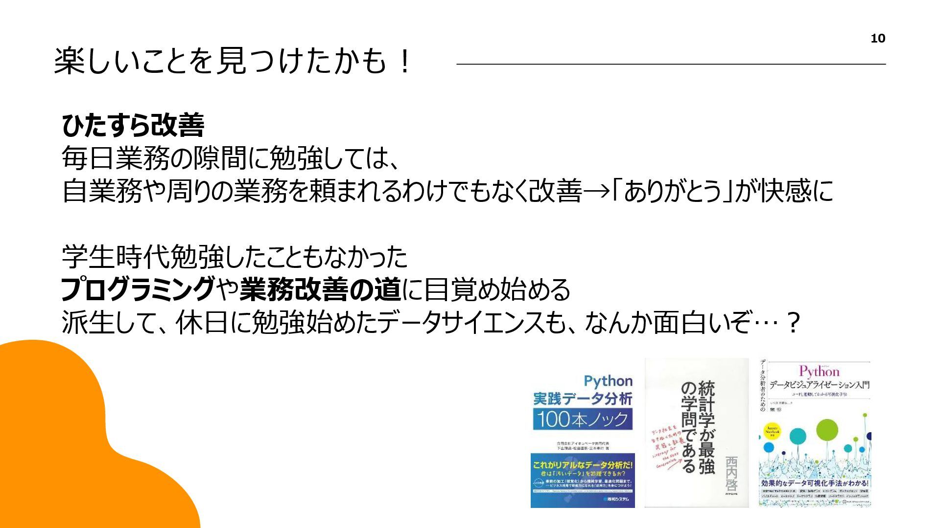 楽しいことを見つけたかも! 10 ひたすら改善 毎日業務の隙間に勉強しては、 自業務や周りの業務を頼まれるわけでもなく改善→「ありがとう」が快感に 学生時代勉強したこともなかった プログラミングや業務改善の道に目覚め始める 派生して、休日に勉強始めたデータサイエンスも、なんか面白いぞ…?